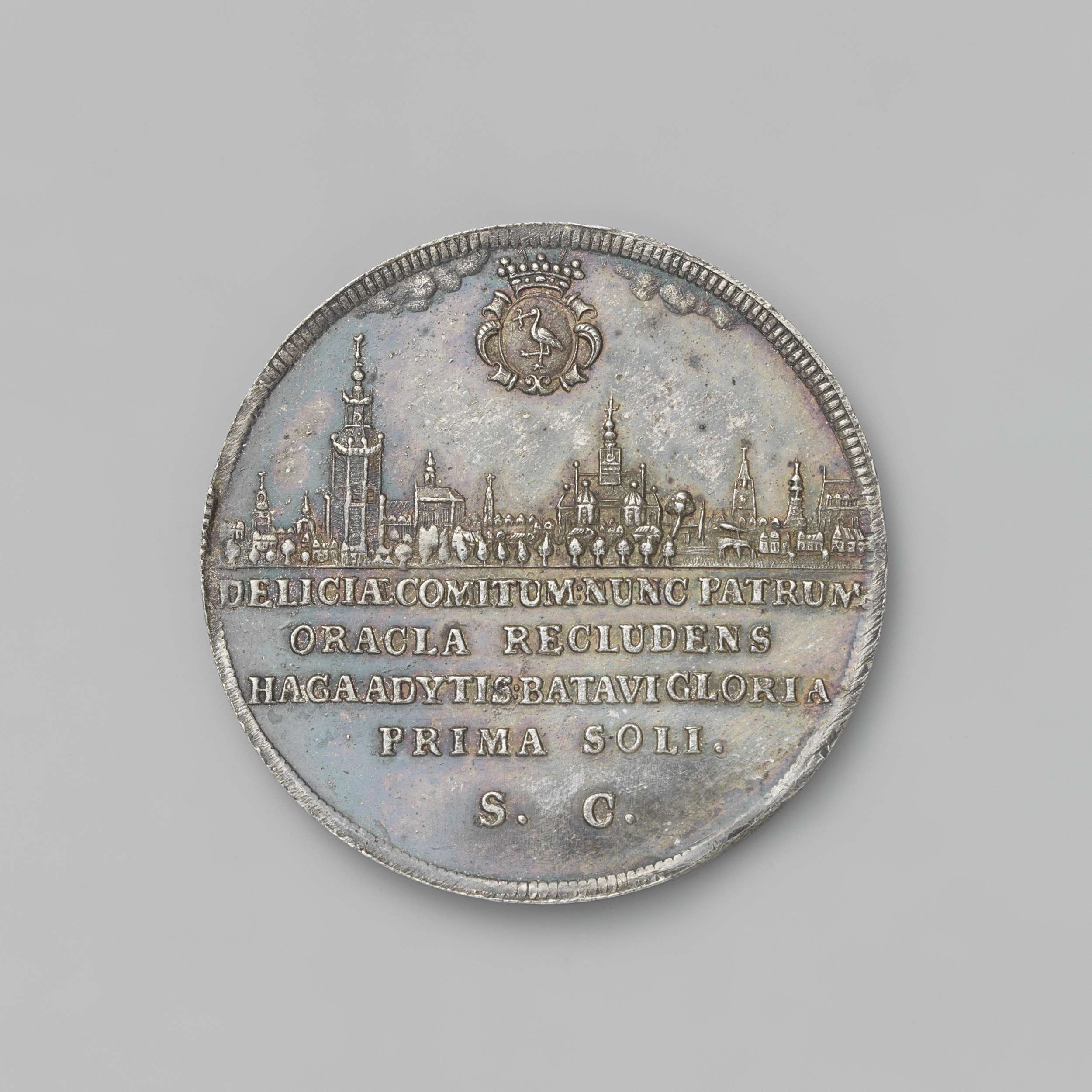 Zilveren penning. Voorzijde: gezicht op stad onder gekroond wapenschild in cartouche; afsnede: opschrift. Keerzijde: vrouw, zittend onder boom in de duinen, houdt weegschaal in rechter- en olijftak in linkerhand; op achtergrond: gezicht op Scheveningen en Noordzee met schepen en Neptunus, staand in zijn wagen
