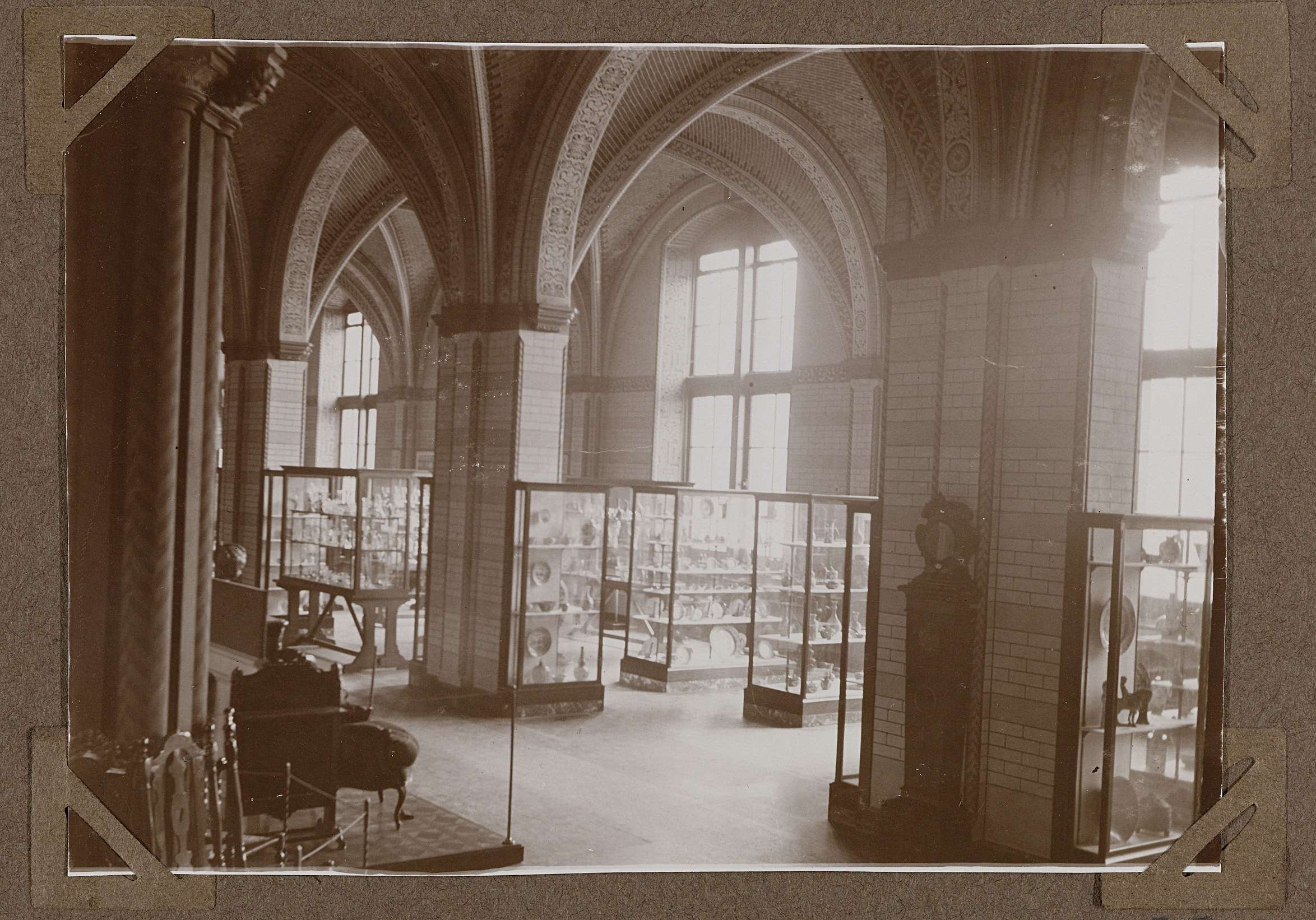 Zaal 203 (foto uit serie 134-138) porseleinzaal, vanuit het zuidoosten, foto genomen naar het noordwesten met zicht op de vensters aan straatzijde, zicht op vitrines in de noordbeuk van deze uit drie beuken bestaande zaal. De vitrines staan in de noordbeuk waar sinds 1952 het publkieksrestaurant D 125 gevestigd is. In deze zaal zijn twee ...