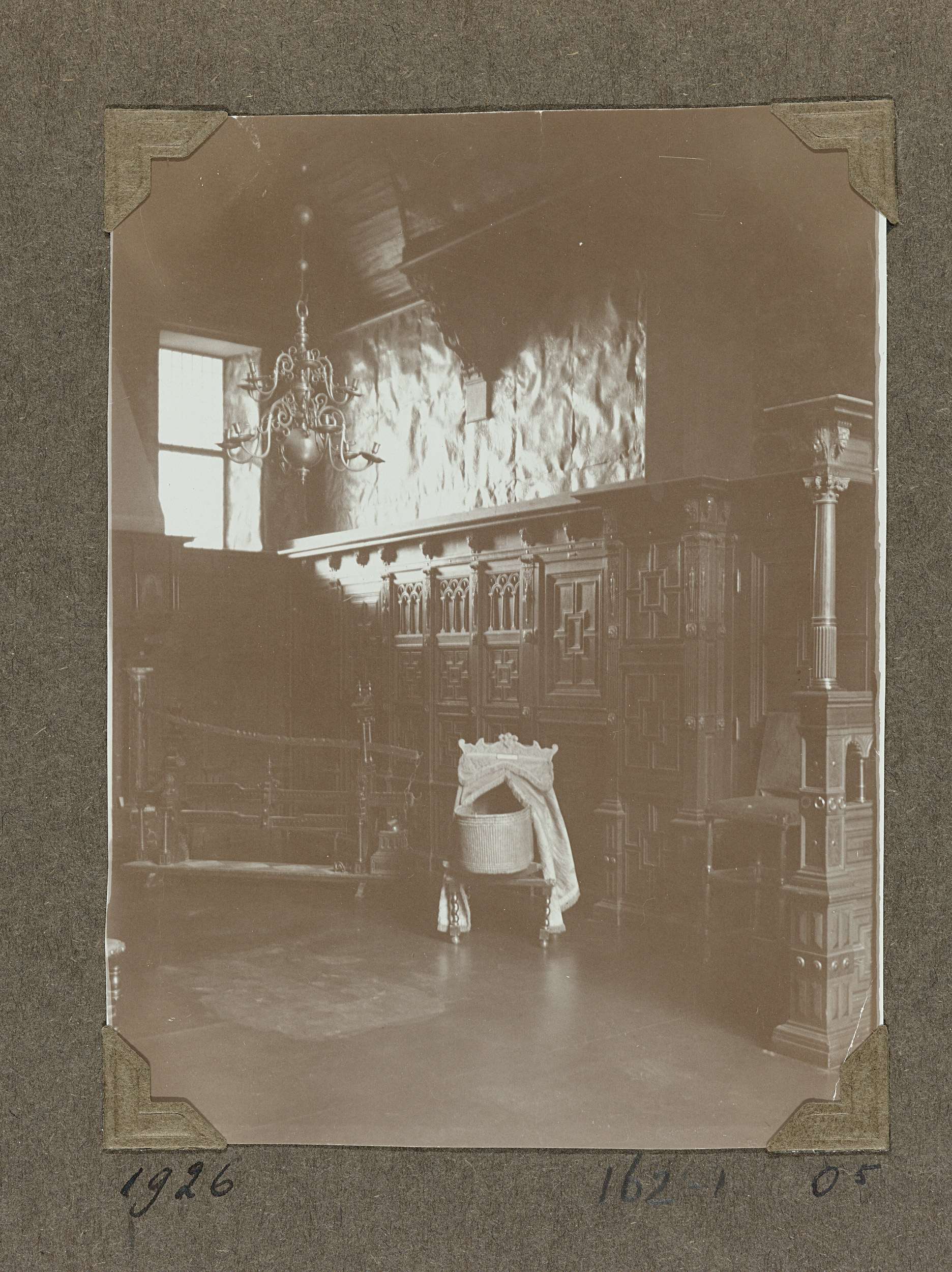 Zaal voor burgelijke bouw- en gebruikskunst; O5 (1926) Zaal 161 of 162 waarvan de wanden voorzien zijn van een betimmering waarboven een goudlederen behang. Tegen de wand staat een wieg opgesteld. Zaal 161-162, 'De schepenzaal van een Raadhuis der XVe eeuw'. Vergelijk foto 163. Verlaagd plafond met gebintstellen en kinderbinten, een kopie van de zoldering ...
