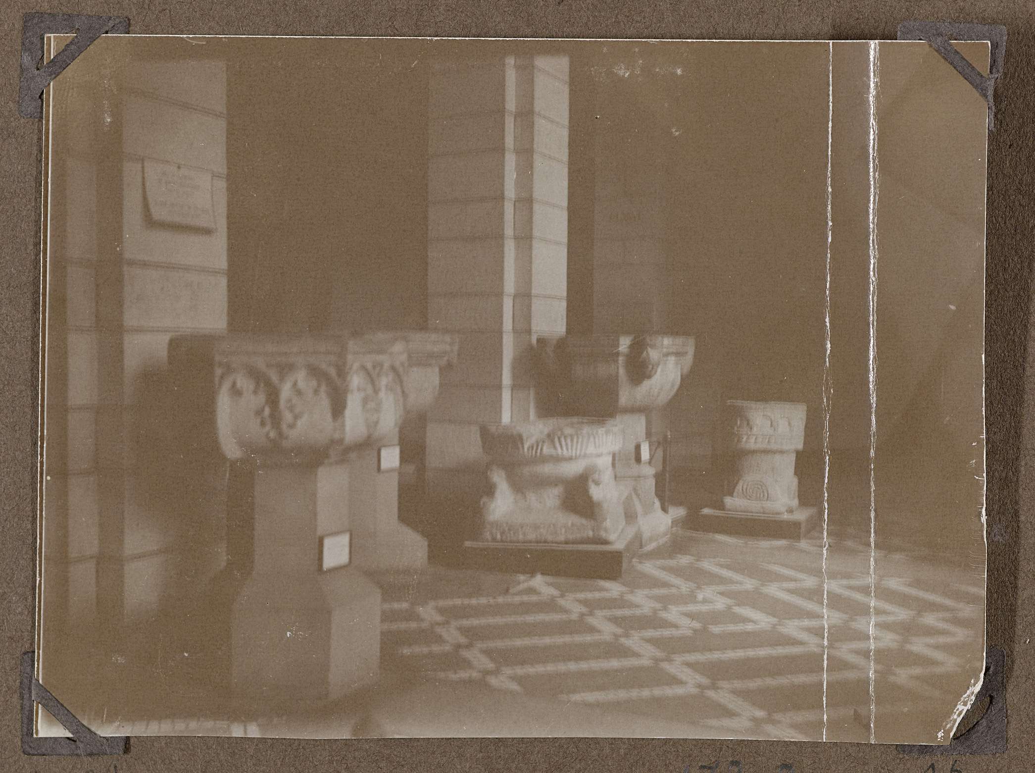 Donkere ruimte met waarin enkele doopvonten zijn te zien. De tegelvloer heeft een schuin ruitmotief.