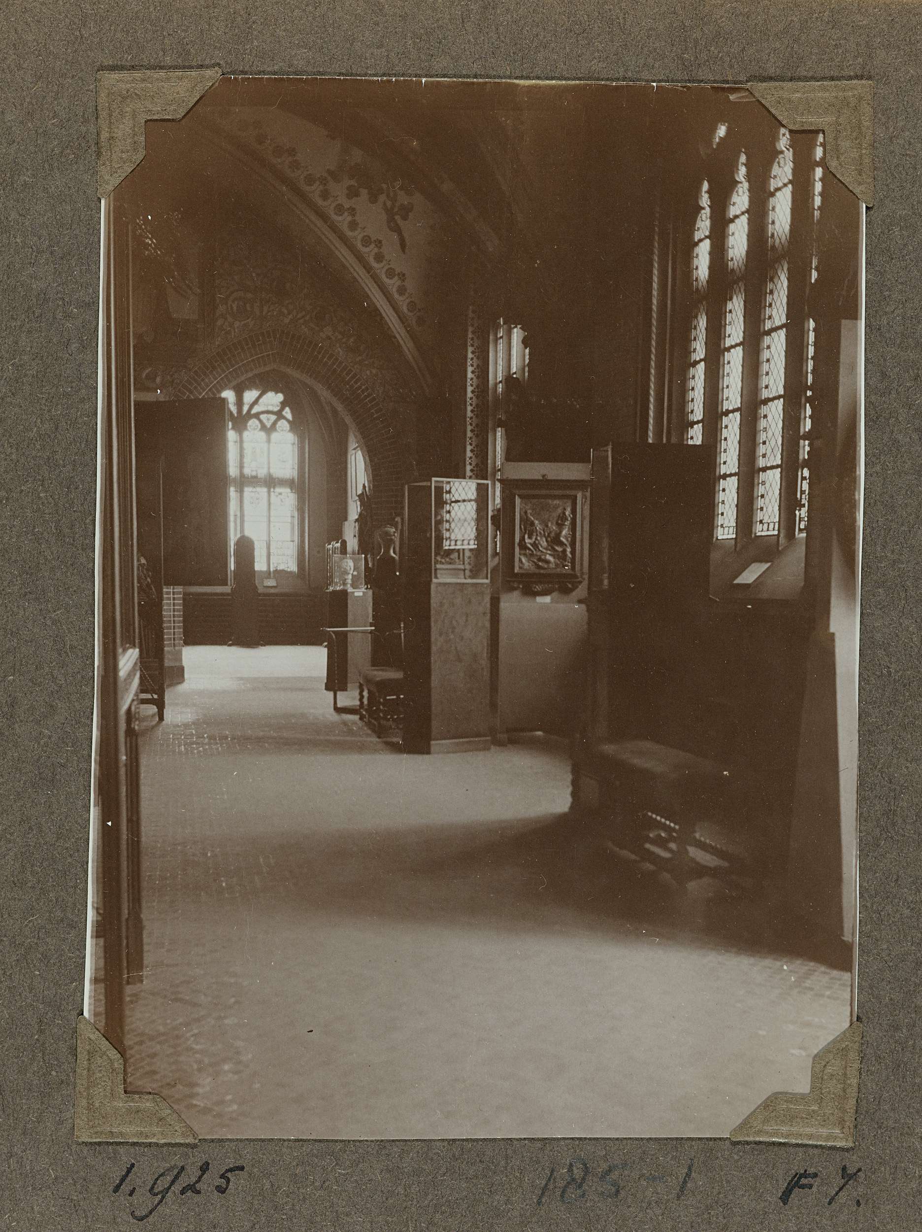 Vanuit zaal 172 zicht op 171 met rechts de gebrandschilderde ramen. Op de achtergrond de doorgang waarboven een klein gedeelte van een muurschildering is te zien en een doorkijkje naar zaal 167 met eveneens gebrandschilderde ramen. Zaal 171 (Cuypersnummering) gezien naar het oosten. Zuidelijk venster zaal 167 naar een model in de St. Willebrordskerk te ...