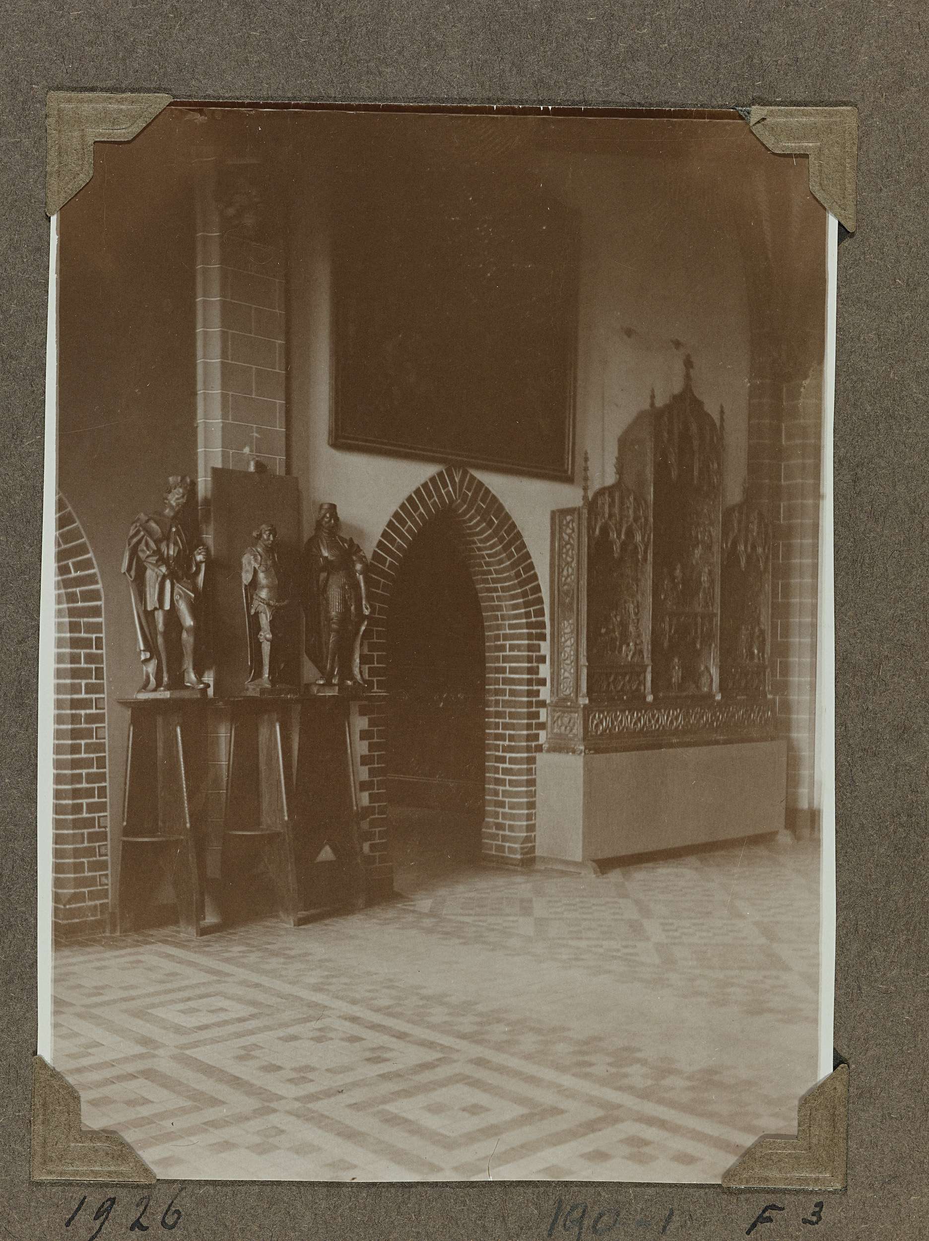 Tegen de noordelijke wand van zaal 167 staan drie standaards waarop beelden zijn opgesteld. Aan weerszijden van de beelden zijn de doorgangen naar de Aduardkapel. Rechts van de doorgang zicht op een gotisch gebeeldhouwd altaarstuk. 'De tekening van de vloer is gevolgd naar die van de cathedraal te St. Omer'. (De Stuers p.30)