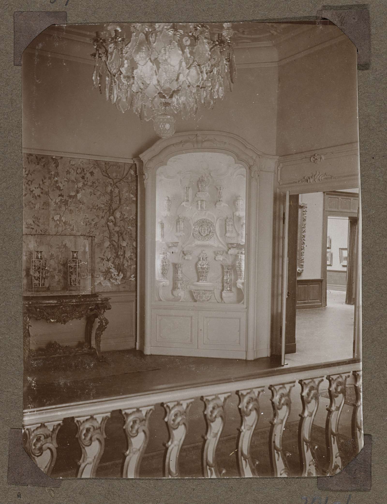 Rotterdams koepelportaal 364 met doorgang naar 365 in de Druckeruitbouw. Zicht op een Louis XV console-tafel waarop een stel zwarte Khangxi vazen zijn geplaatst. In de hoek staat een vitrinekast waar het Chinese porselein van de Druckercollectie in tentoongesteld wordt. De doorgang rechts leidt naar zaal 365. Op de voorgrond is een kristallen kroonluchter te ...
