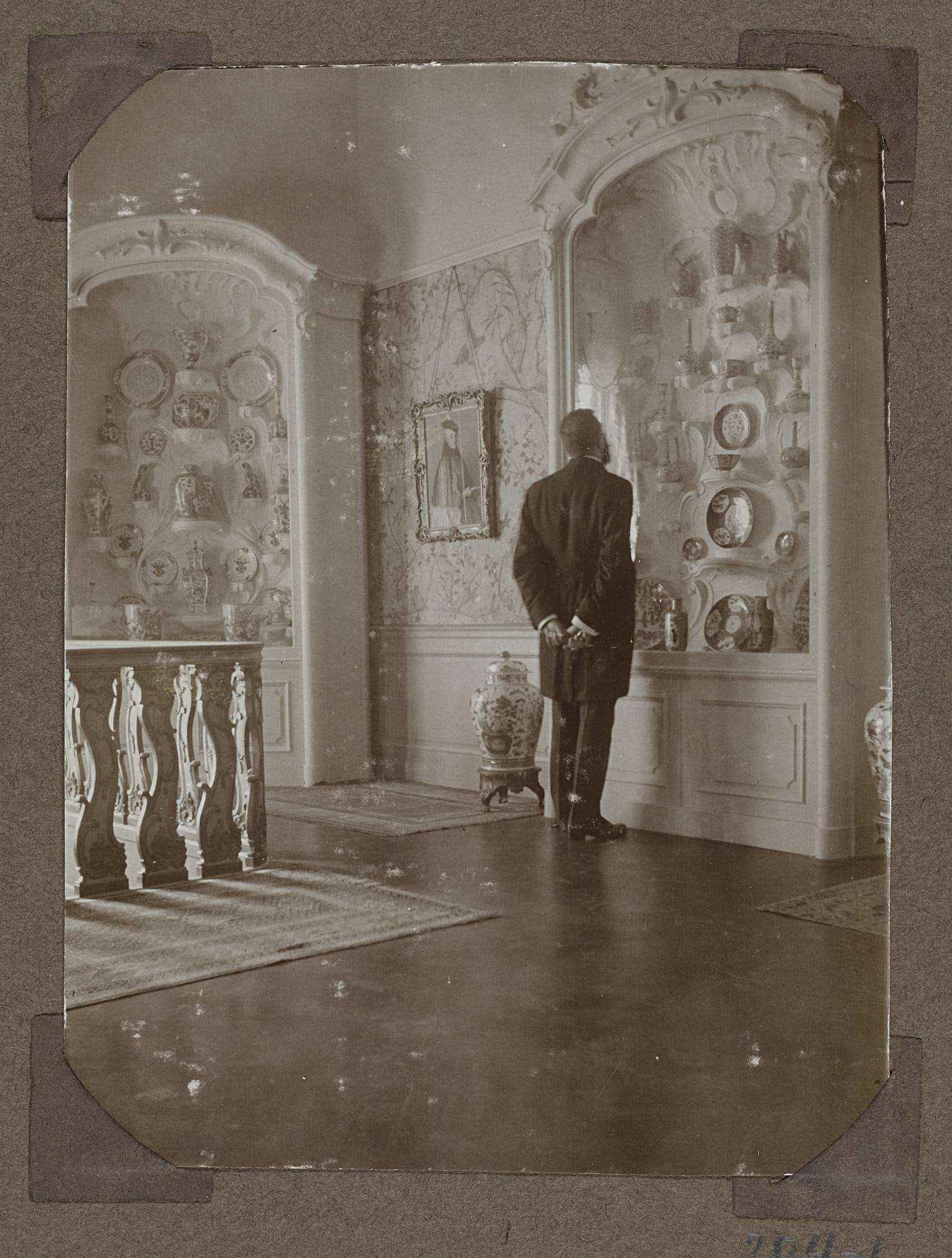 F. Schmidt-Degener bekijkt het porselein in het Rotterdams koepelportaal.De heer F. Schmidt Degener staat met zijn rug op de foto. Hij bekijkt het porselein van de Druckercollectie in de wandvitrine in Louis XV stijl. In de hoek van deze hal staat een kopie van deze wandvitrine die tijdens de verbouwing van 1923 is vervaardigd. Werkzaamheden ...