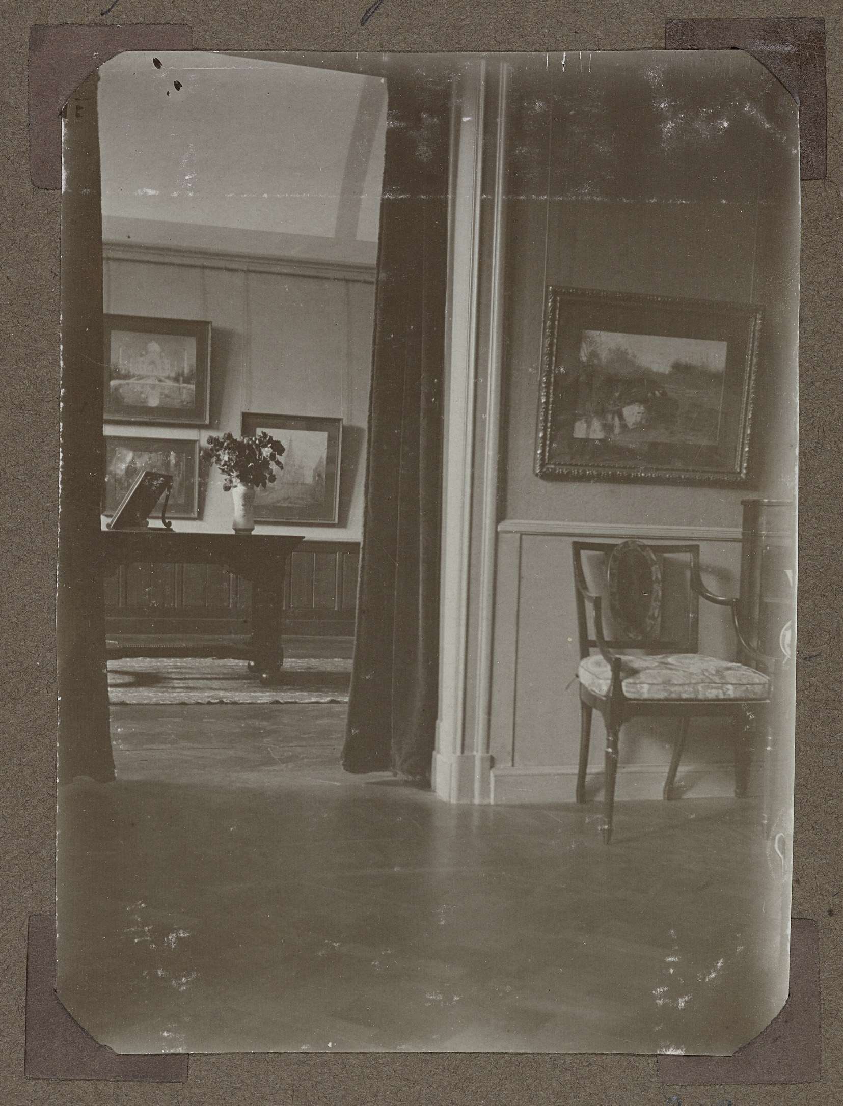 Doorkijkje naar zaal 359 waar o.a. aquarellen te zien zijn van M.A.J. Bauer, getiteld "De Tai-Mahal bij nachtlicht" en "Het Kremlin te Moskou". Zaal 16 met doorkijk naar zaal 17 (RMA nummers), dus gezien naar het zuiden. Parket, lambizering, kooflijst.