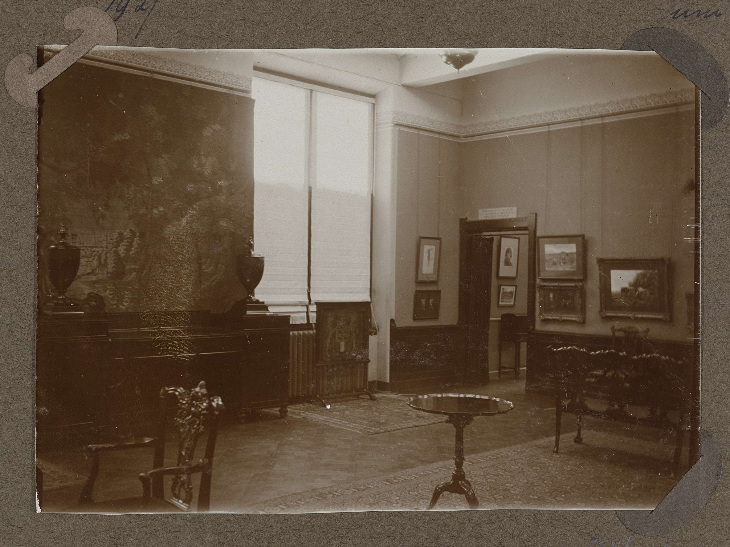 Deze zaal is is ingericht met18e eeuwse Engelse Chippendale en Sheraton meubelen, waaronder op de voorgrond een stoel een rond tafelje. Aan de oostelijke wand zicht op een buffetkast met twee vazen. Hierboven hangt een groot wandtapijt. In zaal 374 worden aquarellen en tekeningen tentoongesteld van de Haagse School waaronder J. Israels, J. en M. ...