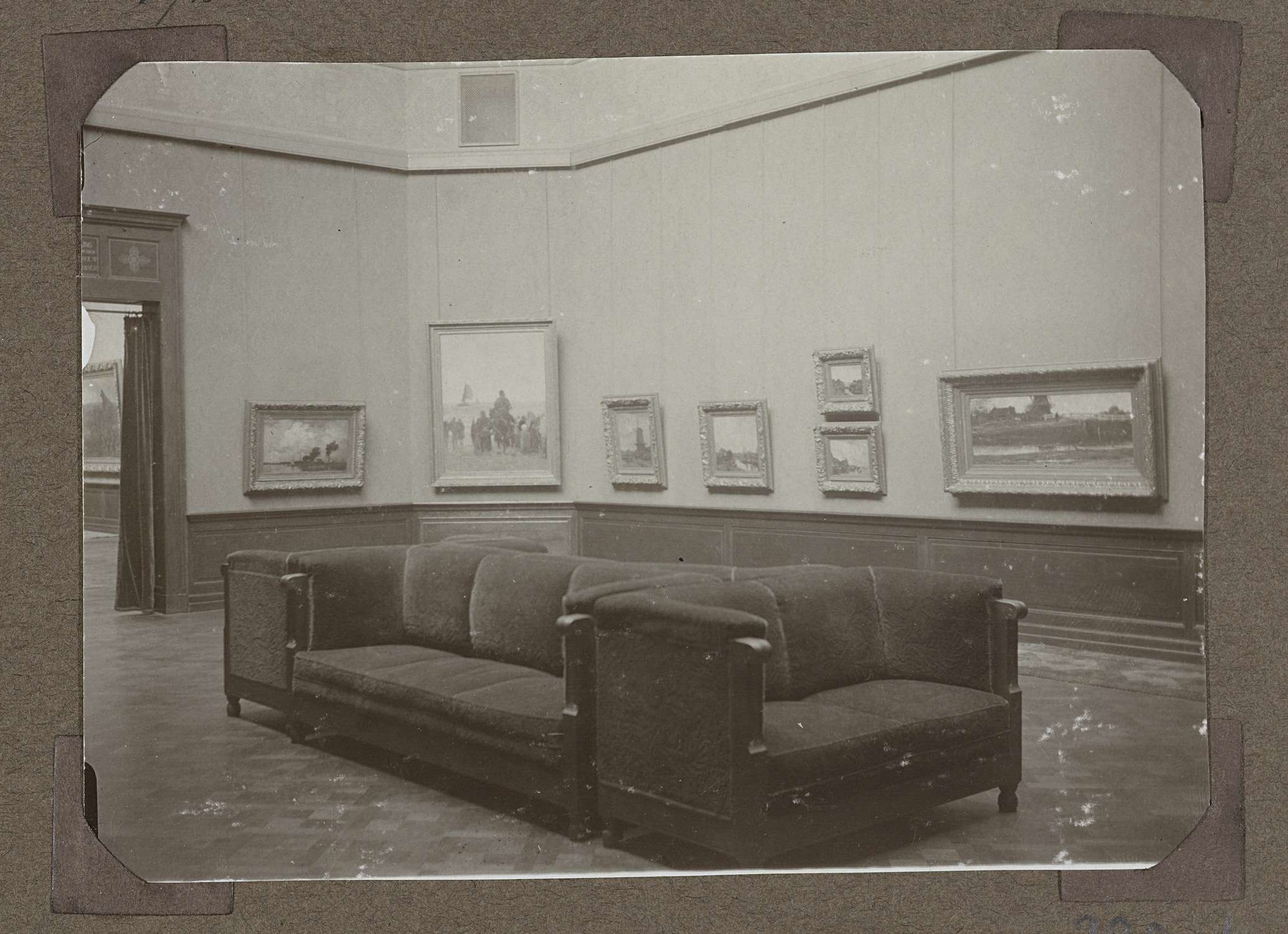 Hoek van zaal 372 waar werken van A. Mauve, J. Weissebruch en J. Maris tentoongesteld worden. Hier oa. zicht op drie werken van J.H. Maris. In het midden van de zaal zijn vier banken tegenelkaar geplaatst. Links is de doorgang naar de volgende ruimte. Vergelijk nr: 4092 Zaal M 149 in Druckeruitbouw. Parket, lambizering, houten ...