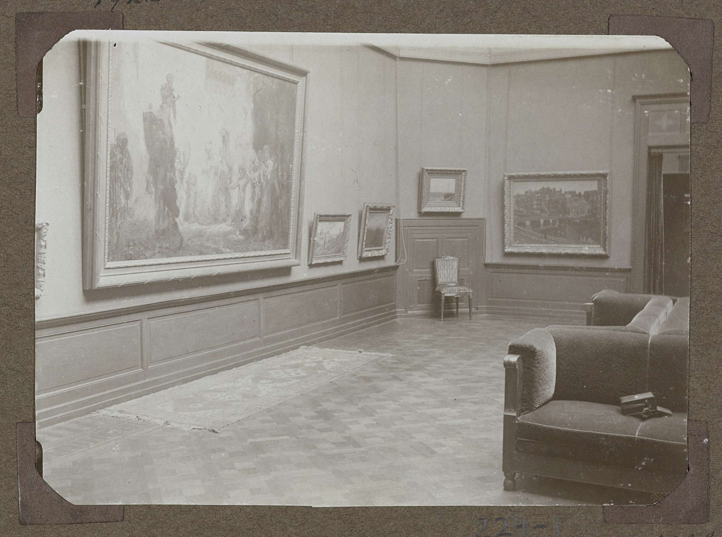 In deze zaal worden twee Amsterdamse meesters getoond G.H. Breitner en M. Bauer. Links aan de wand een groot schilderij van M. Bauer, getiteld "Oosterse bruiloft". Links naast de doorgang zicht op een werk van Breitner. Zaal 369, west- en noordwand. Parket, lambizering, houten deuromlijsting waarboven gedecoreerde panelen. Kenmerkend voor de oorspronkelijke opzet van dit ...