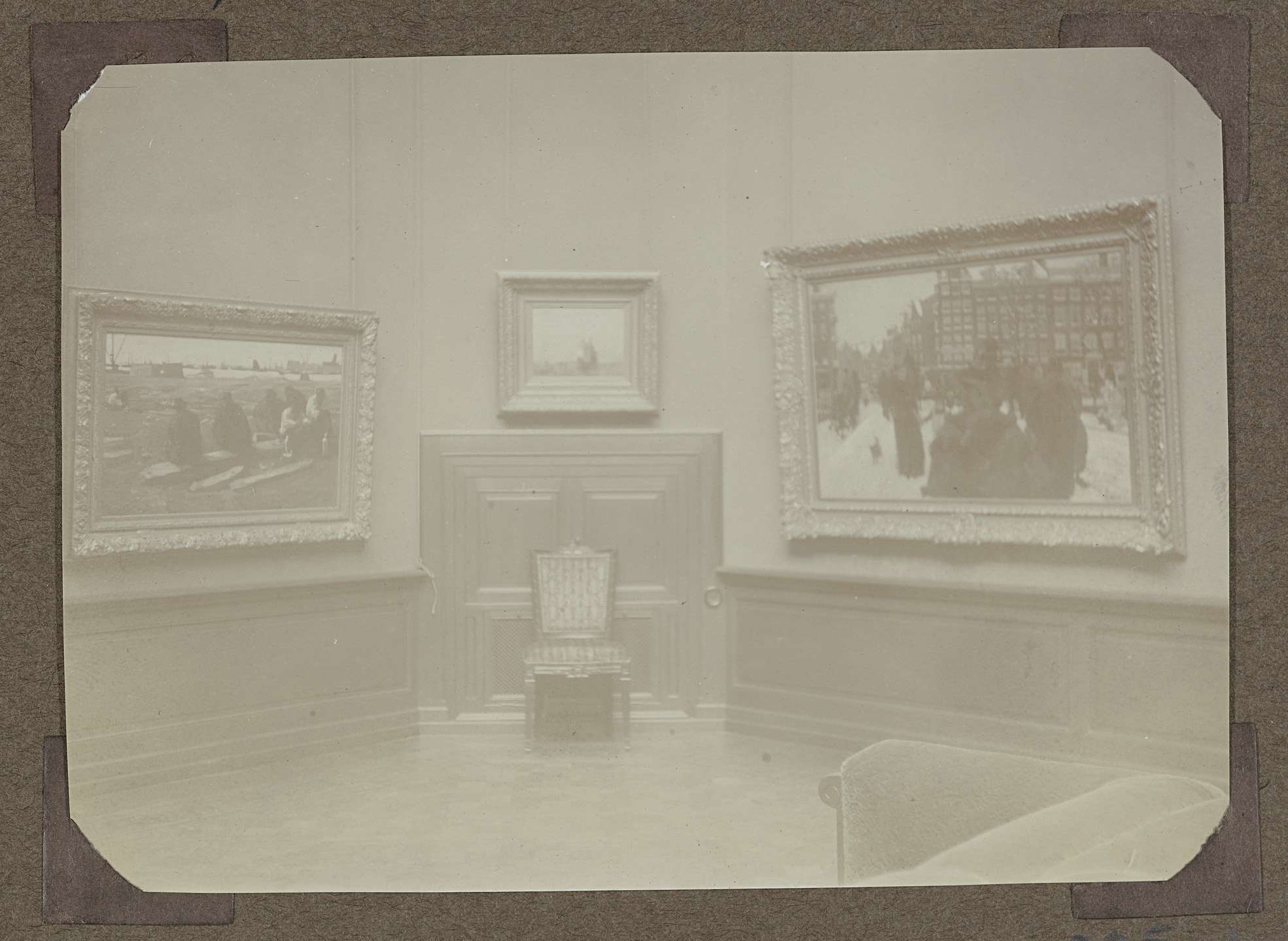 Hoek van zaal 369 met links zicht op het schilderij "Schafttijd in de bouwput aan de van Diemenstraat te Amsterdam", rechts "De Singelbrug bij de Paleisstraat te Amsterdam" van G.H. Breitner. In de hoek staat tegen de schuine wand een stoel waarboven een klein schilderij te zien is. Zaal 369, vermoedelijk hoek zuid- en oostwand. ...
