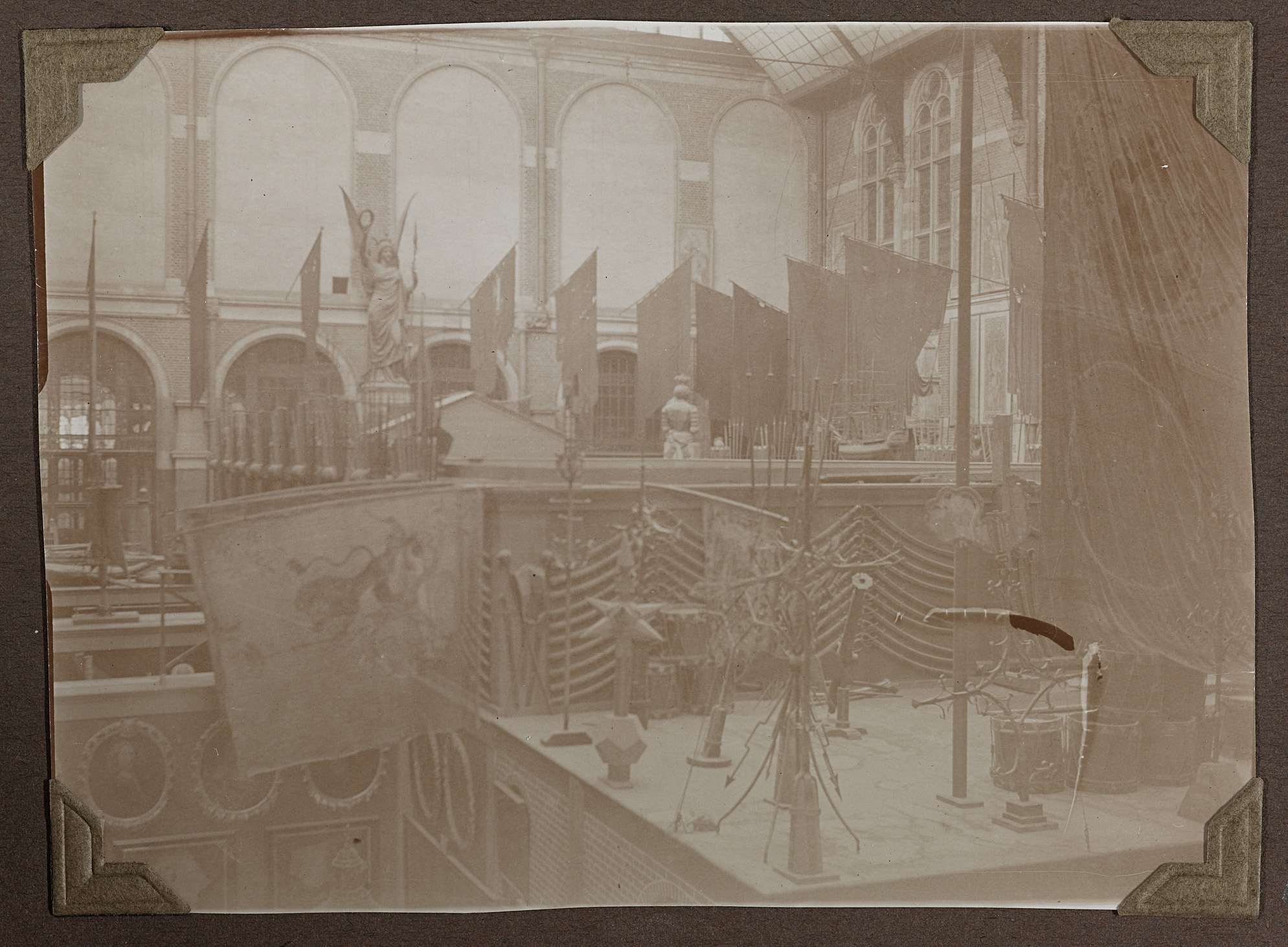 Vanaf boven zicht op de binnenplaats met de verschillende inbouwen. Op de achtergrond zijn de ramen te zien met zicht op de onderdoorrit. In het midden van de foto staat een groot gevleugeld Victoriabeeld vervaardigd door de beeldhouwer Bart van Hove. Oostelijke binnenplaats gezien naar het noordwesten. Houten vloer, muren in schoon metselwerk, lichtkap met ...