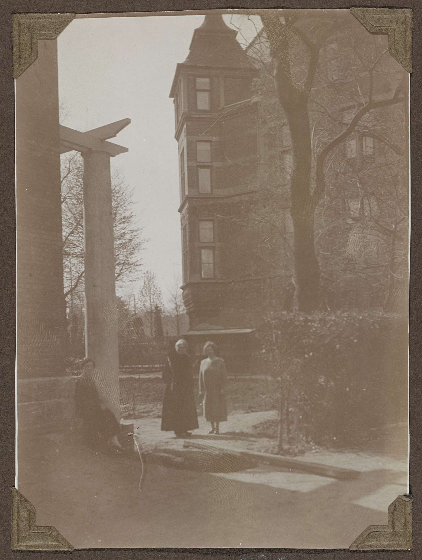 Drie dames poseren tussen de villa en de Teekenschool in 1924