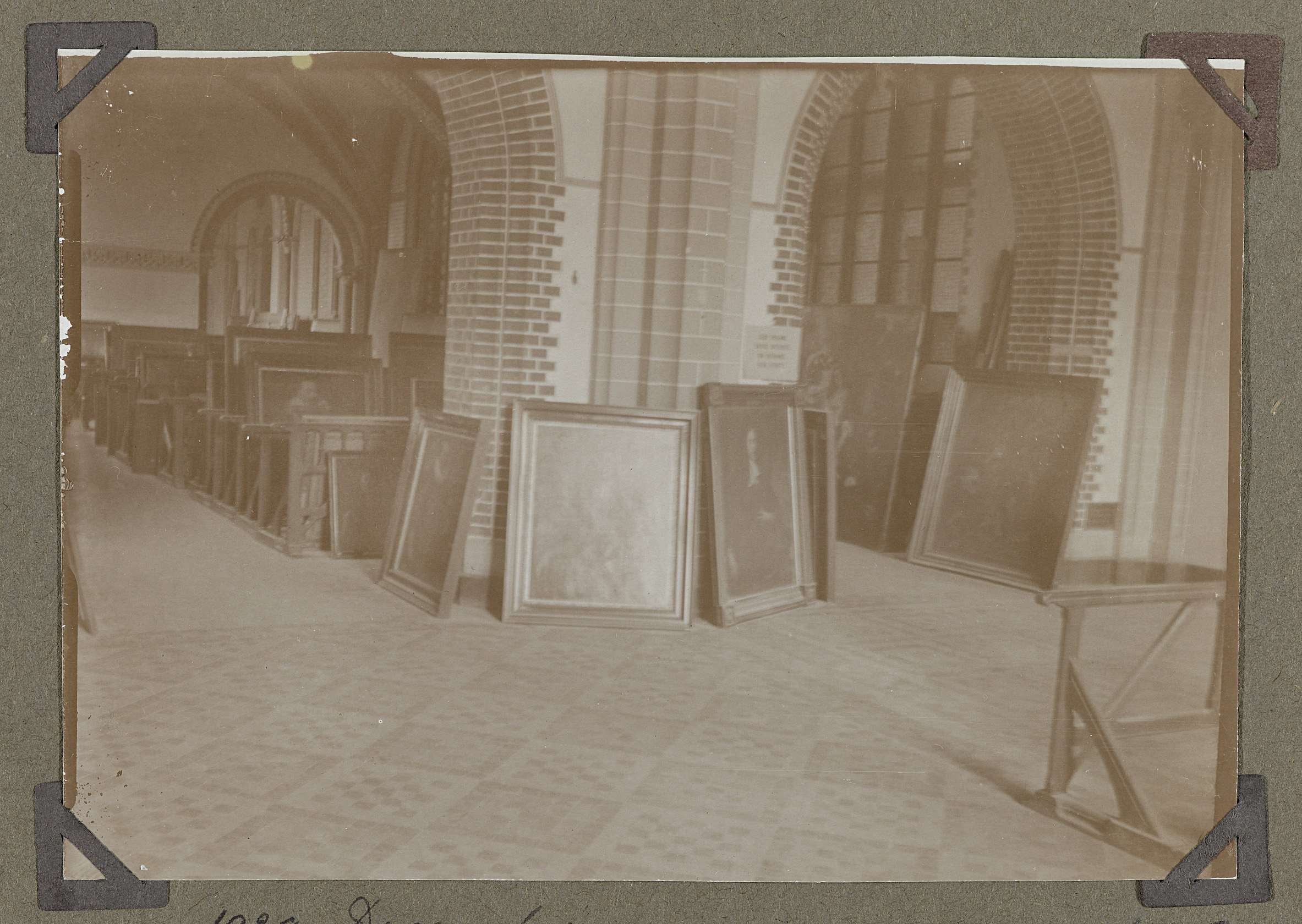 Zaal met booggewelven waar tijdens de verbouwing de schilderijen op de grond staan opgeslagen. Verbouwing van de zalen Nederlandse geschiedenis, hier op de begane grond. Door de vensters rechts op de achtergrond worden deze zalen vanuit de oostelijke binnenplaats verlicht.