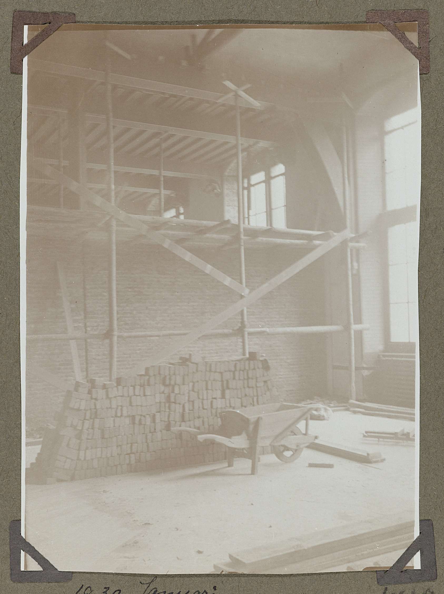 Zaal gezien naar het zuidwesten. De zaal wordt verbouwd. Boven een deel een kopie van de zoldering van het stadhuis van Sluis, die in het jaar waarin deze foto is genomen, is verwijderd. Er wordt een muur geplaatst, die de ruimte in tweeën deelt.