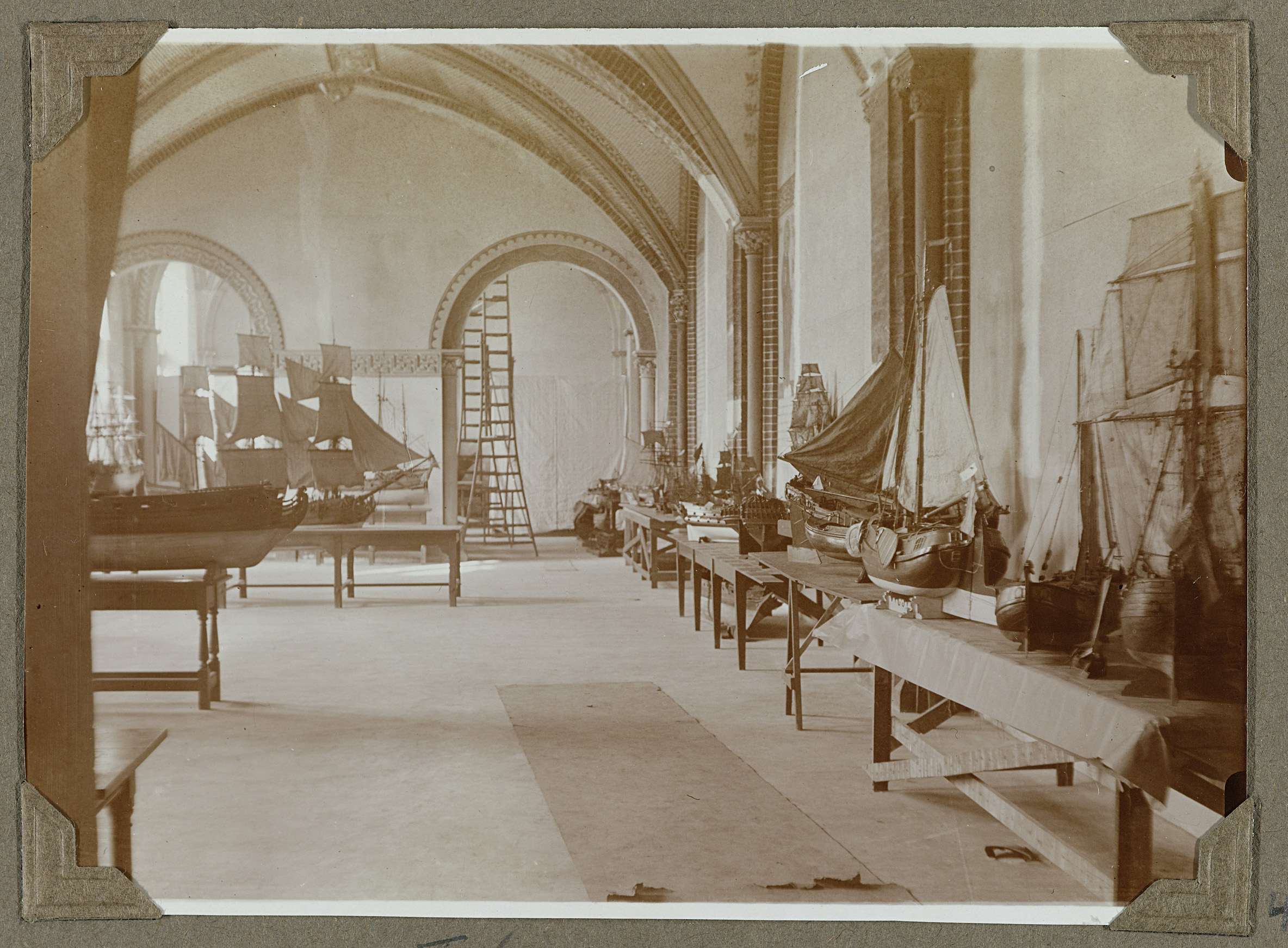 Zaal 171-173 gezien naar het westen. Herinrichting voor de vaste tentoonstelling de Geschiedenis ter Zee. Op deze afbeelding zijn vooral de zalen 172 en 173 in het zicht. De scheepsmodellen staan in een proefopstelling op tafels. Op 24 oktober 1931 werd de tentoonstelling geopend. Het gewelf, de zuilen en de twee doorgangen behoren tot de ...