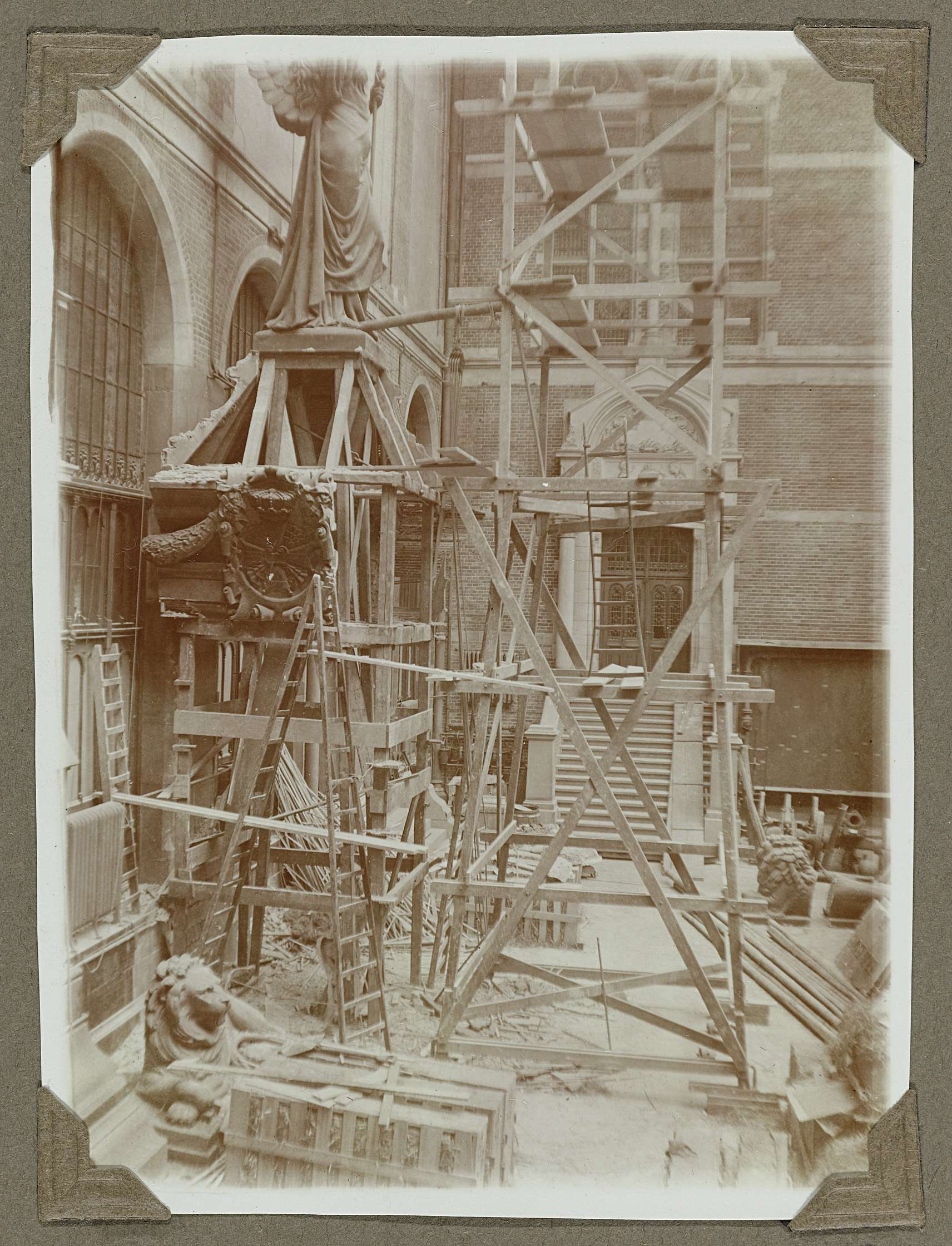 Oostelijke binnenplaats gezien naar het noordwesten. Links de vensters van de doorrit waarvoor een grote stellage staat waarop een gedeelte van het beeld van Victoria ('Atjehmonument') te zien is. In het midden van de foto zicht op de oorspronkelijke toegang met beeldhouwwerk van toren II. Boven de toegang is het metselwerk uitgevoerd in decoratieve patronen. ...
