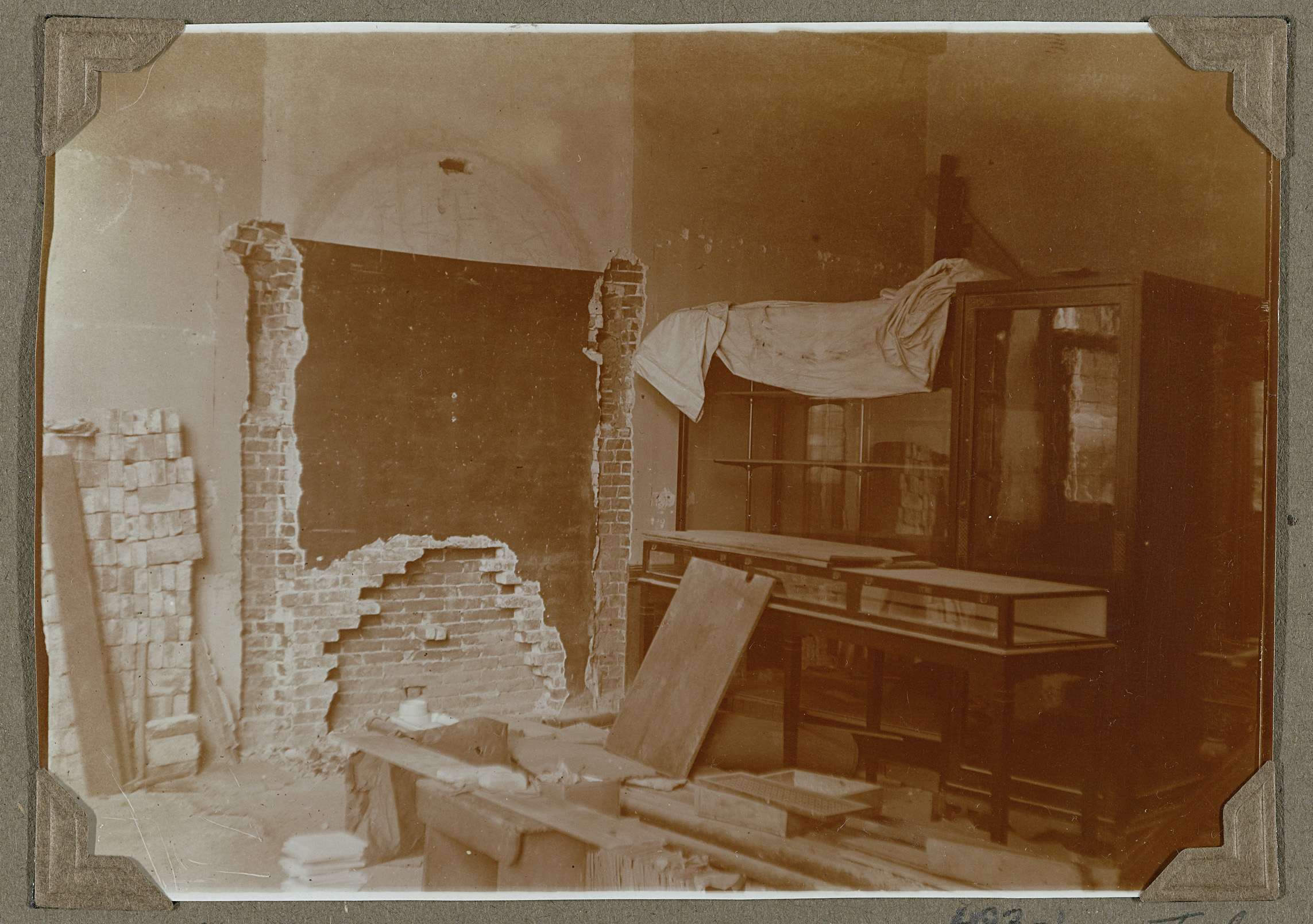 Zicht op een gesloopte muur met links hiervan een aantal lege vitrinekasten. Foto te vergelijken met 458