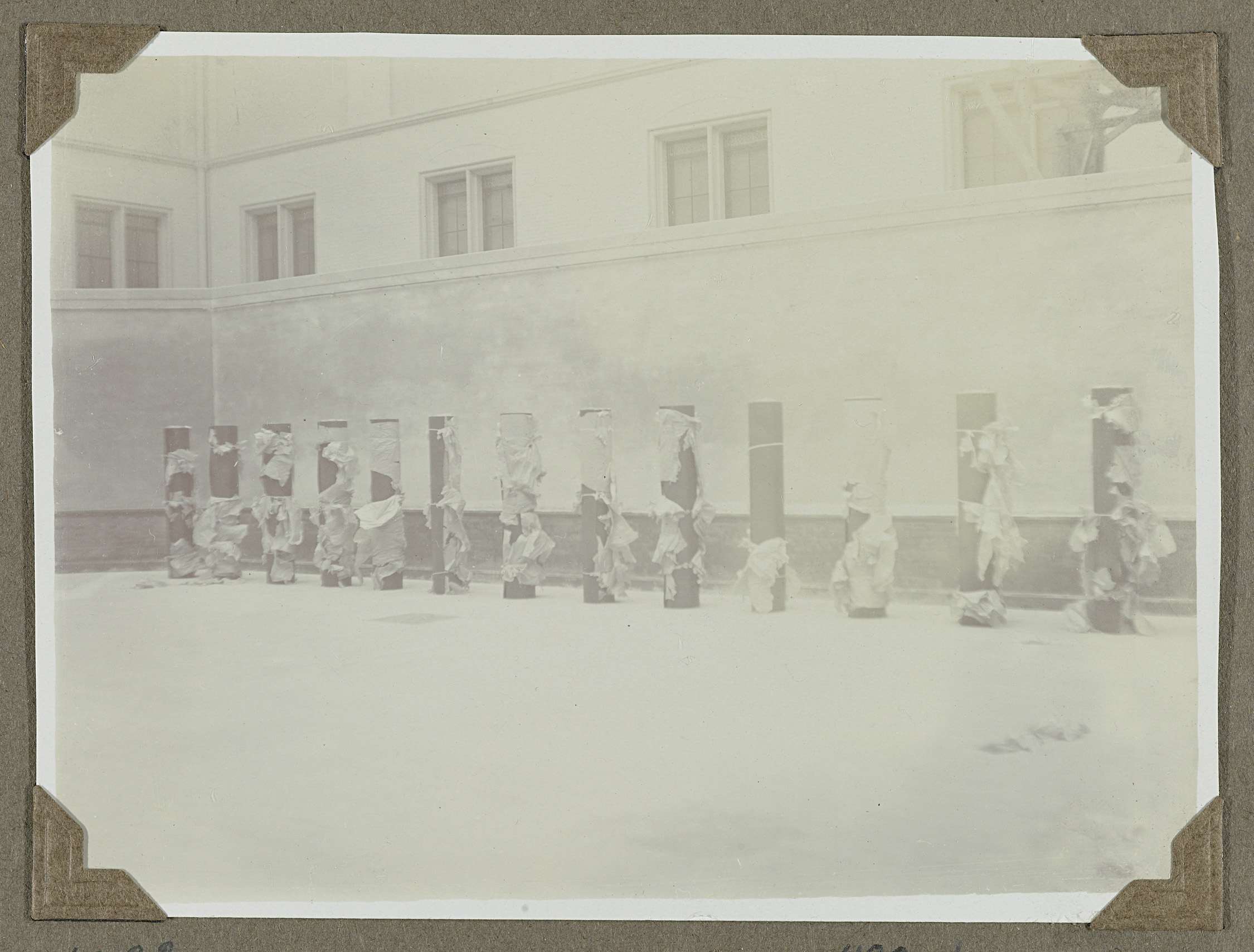 De linker binnenplaats waarvan de gebonneerde vloer en de gemetselde muren gereed waren op 26 maart 1932. Op een rij staan de rollen linoleum klaar om gelegd te worden.,