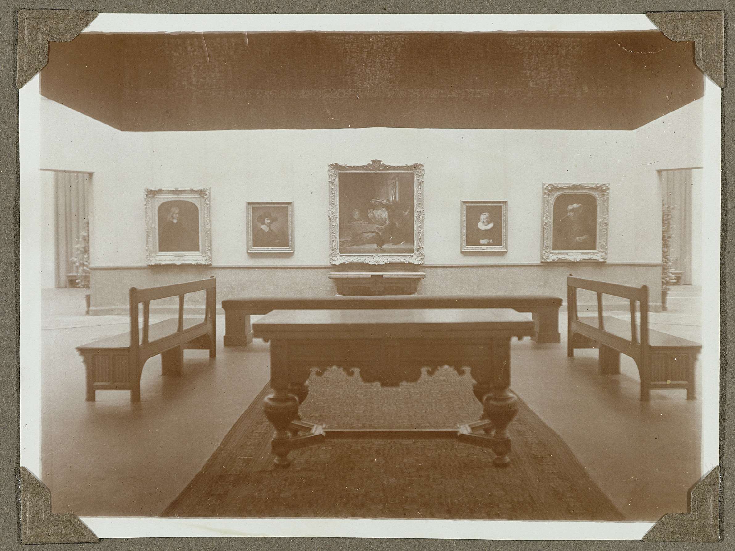 Middenzaal met schilderijen, banken, lambrisering en vooraan een 17e-eeuwse tafel