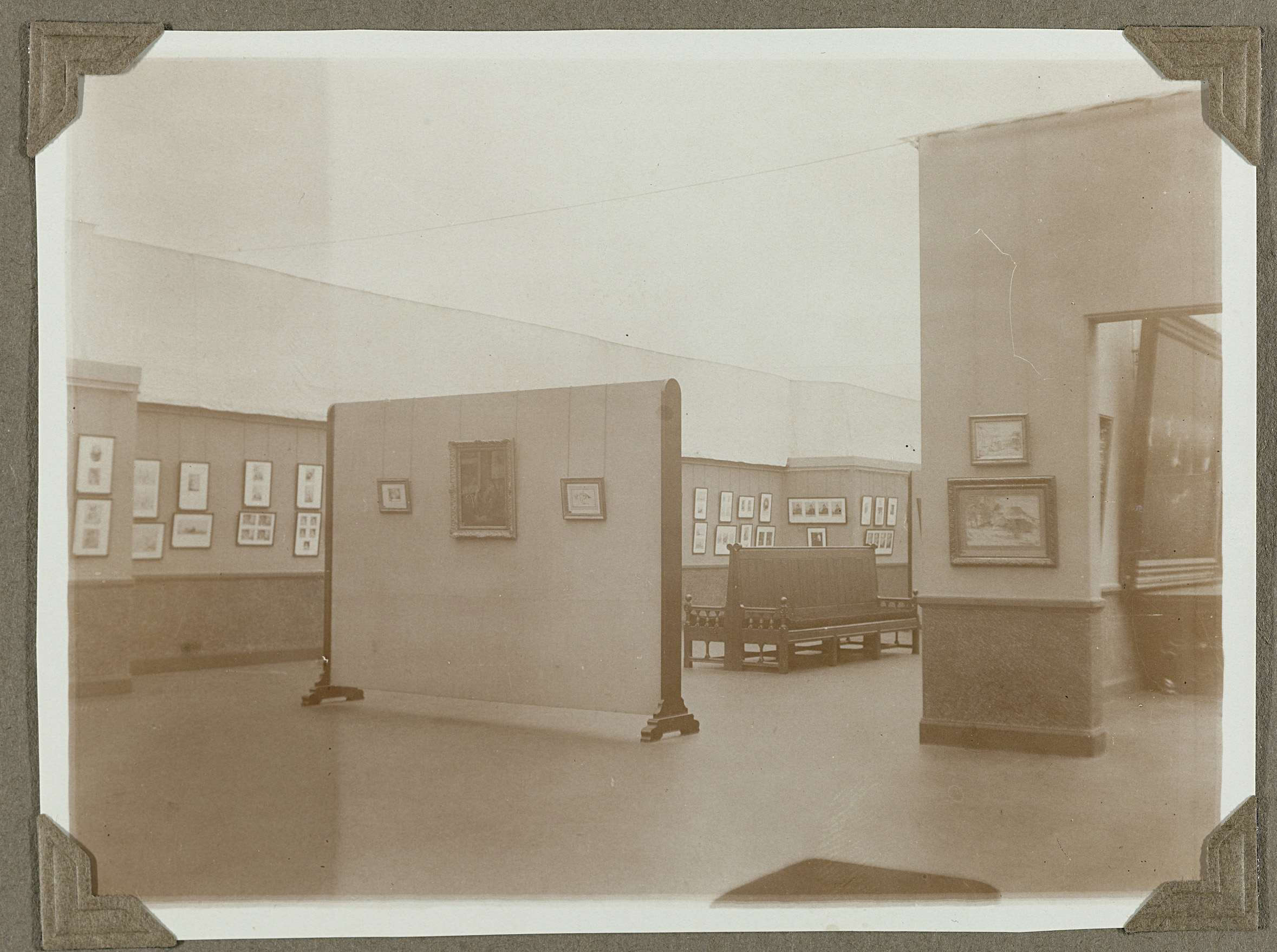 Opstelling van tekeningen en etsen tijdens de Rembrandt tentoonstellling in de oostelijke binnenplaats. Aan de linker wand zicht op vele tekeningen en etswerk. In het midden van de zaal een verplaatsbaar schot met een schilderij en twee kleine werkjes. Rechts zicht op een wand met een doorgang naar een volgende zaal met opstelling van schilderijen. ...