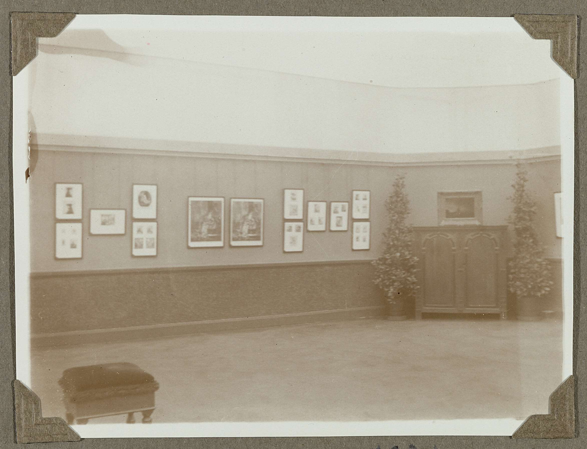 Opstelling van tekeningen en etsen tijdens de Rembrandtentoonstelling in de oostelijke binnenplaats. Aan de linker wand zicht op vele tekeningen en etswerk. In de hoek van de zaal staat een kast met aan weerszijden een laurierboompje. Op de voorgrond links staat een tabouret. Deze tentoonstelling werd gehouden in de zojuist gebetonneerde linker binnenplaats ter plechtige ...