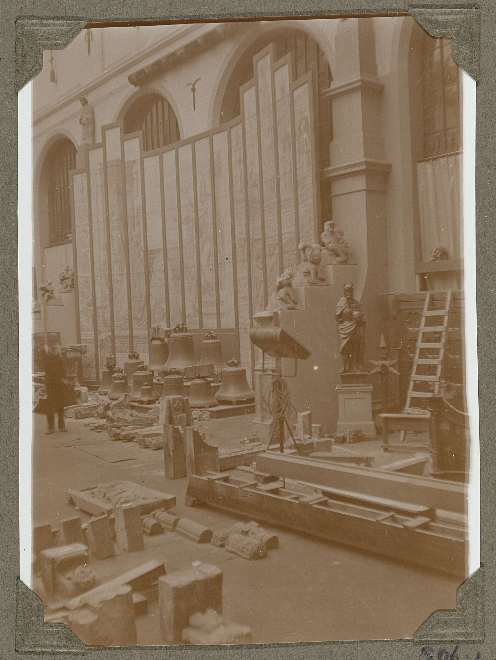 Westelijke binnenplaats gezien naar het noordoosten. De binnenplaats wordt heringericht. De gevel is gewit. Op de achtergrond de vensters van de doorrit en twee steunberen die zijn voorzien van beeldhouwwerk. Voor de glazen wand van de onderdoorgang staat een groot wandscherm. Hiervoor staan enige klokken en verschillende bouwfragmenten.