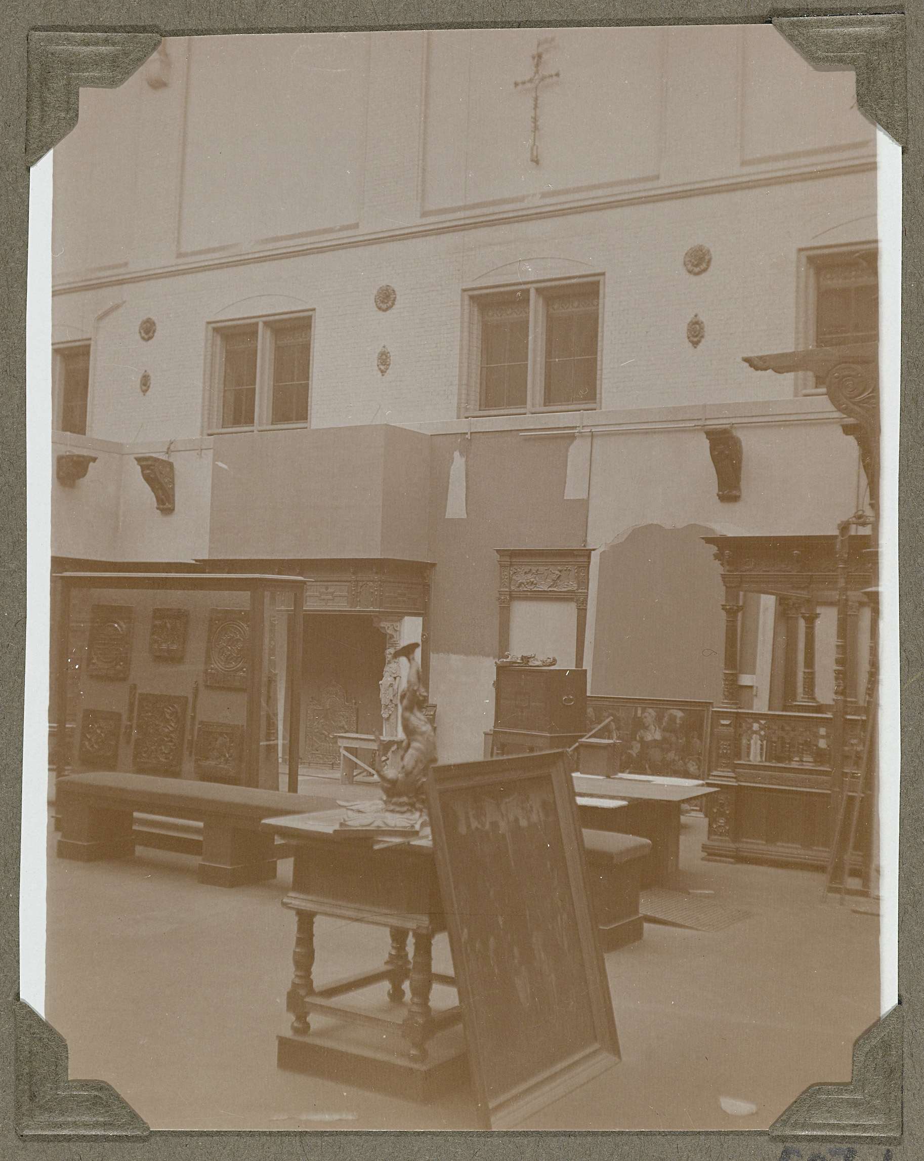 Westelijke binnenplaats gezien naar het noordwesten. De binnenplaats wordt heringericht. De oorspronkelijke gevel van de binnenplaats gevel is gewit. Voor de oorspronkelijke noord-, west- en zuidgevel is in 1929? een "ringmuur" geplaatst, die op deze onduidelijke foto te zien is. Tegen deze ringmuur zijn voorwerpen opgehangen? De binnenplaats is in 1932 vervolgens ingedeeld in een ...