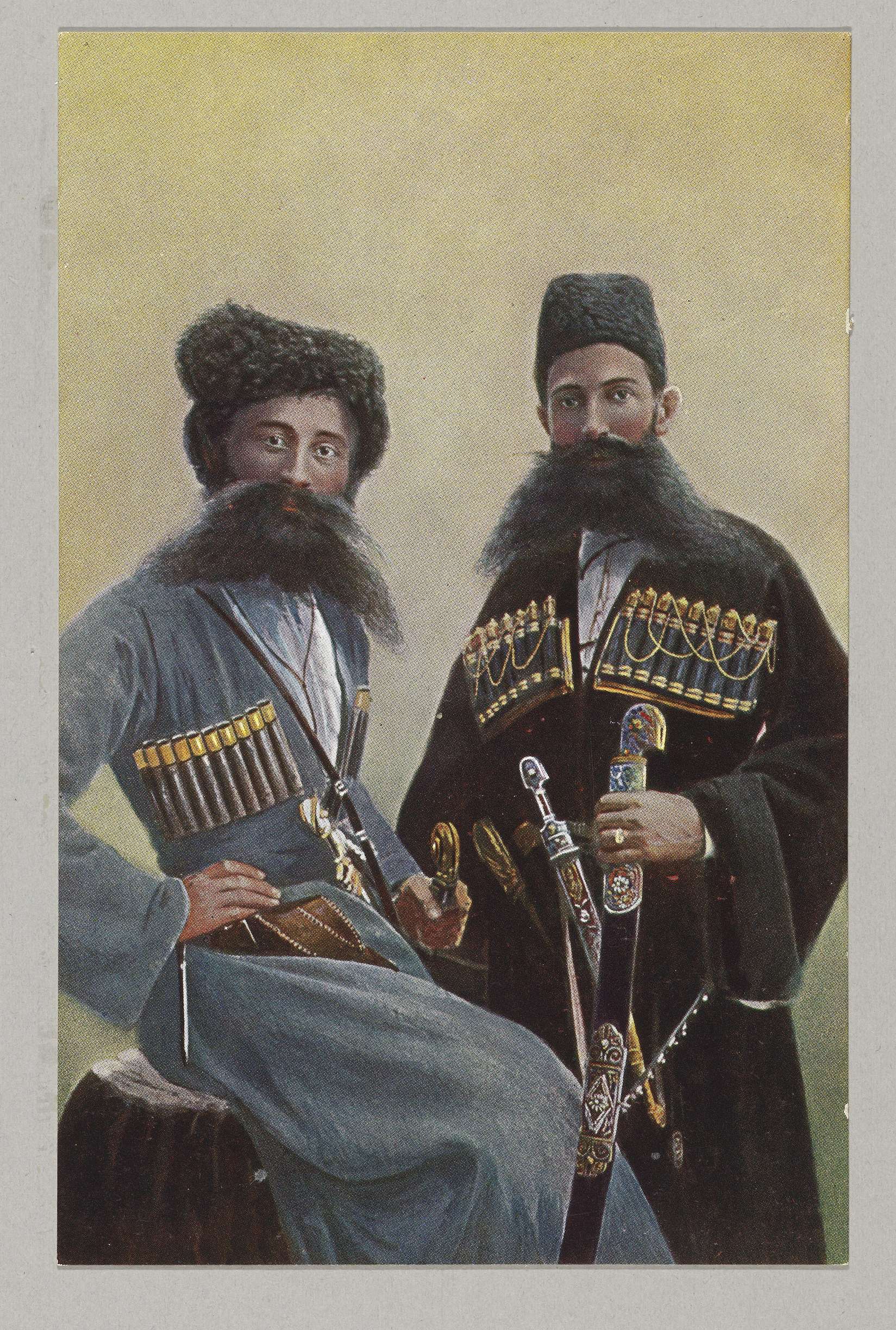 Een zittende en een staande man, waarvan de laatste een sabel in de hand heeft. Beide mannen hebben een baard.