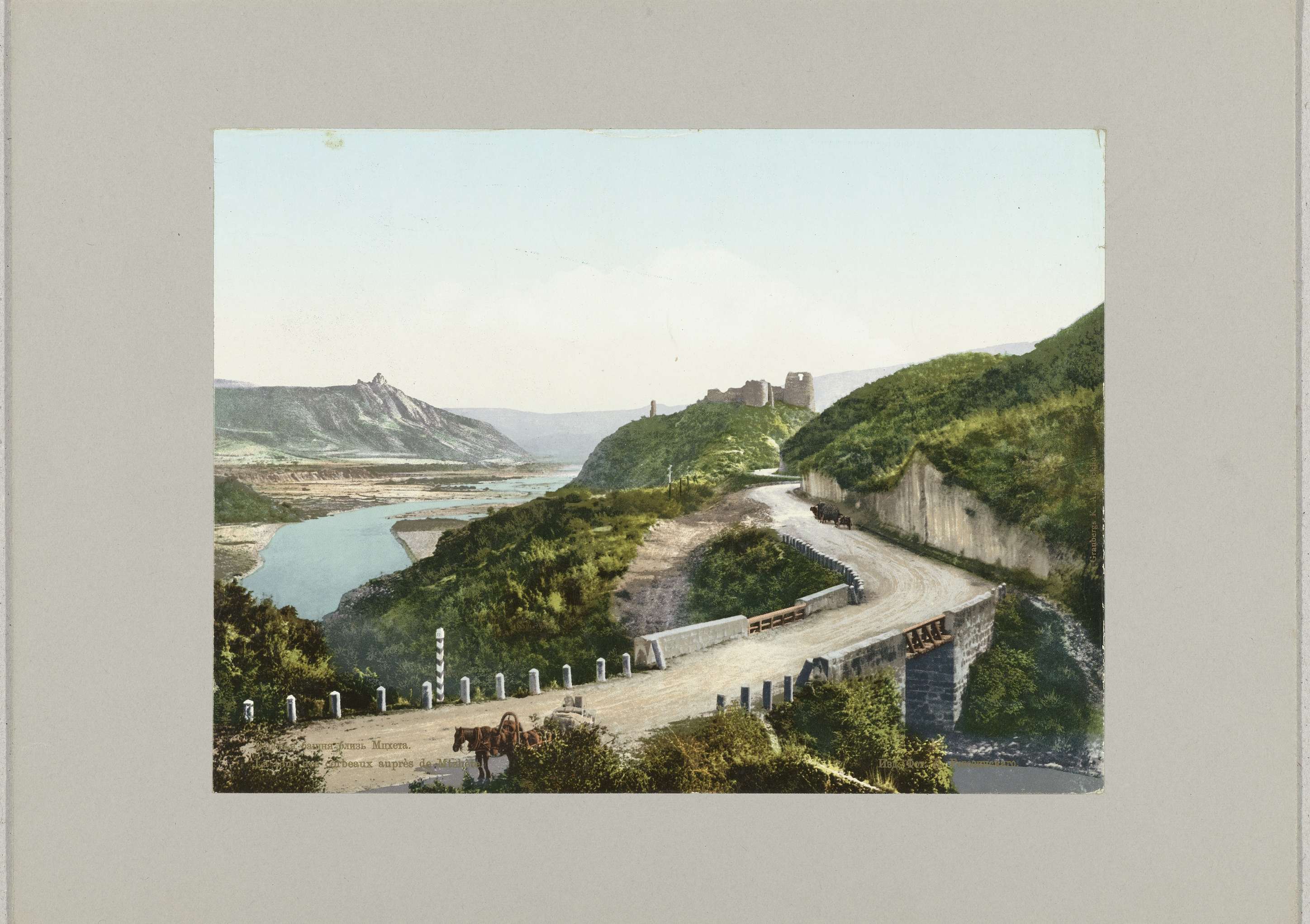 Weg waarop linksonder twee paarden voor een wagen gespannen staan, daarnaast staat de titel in het Russisch en in het Frans.