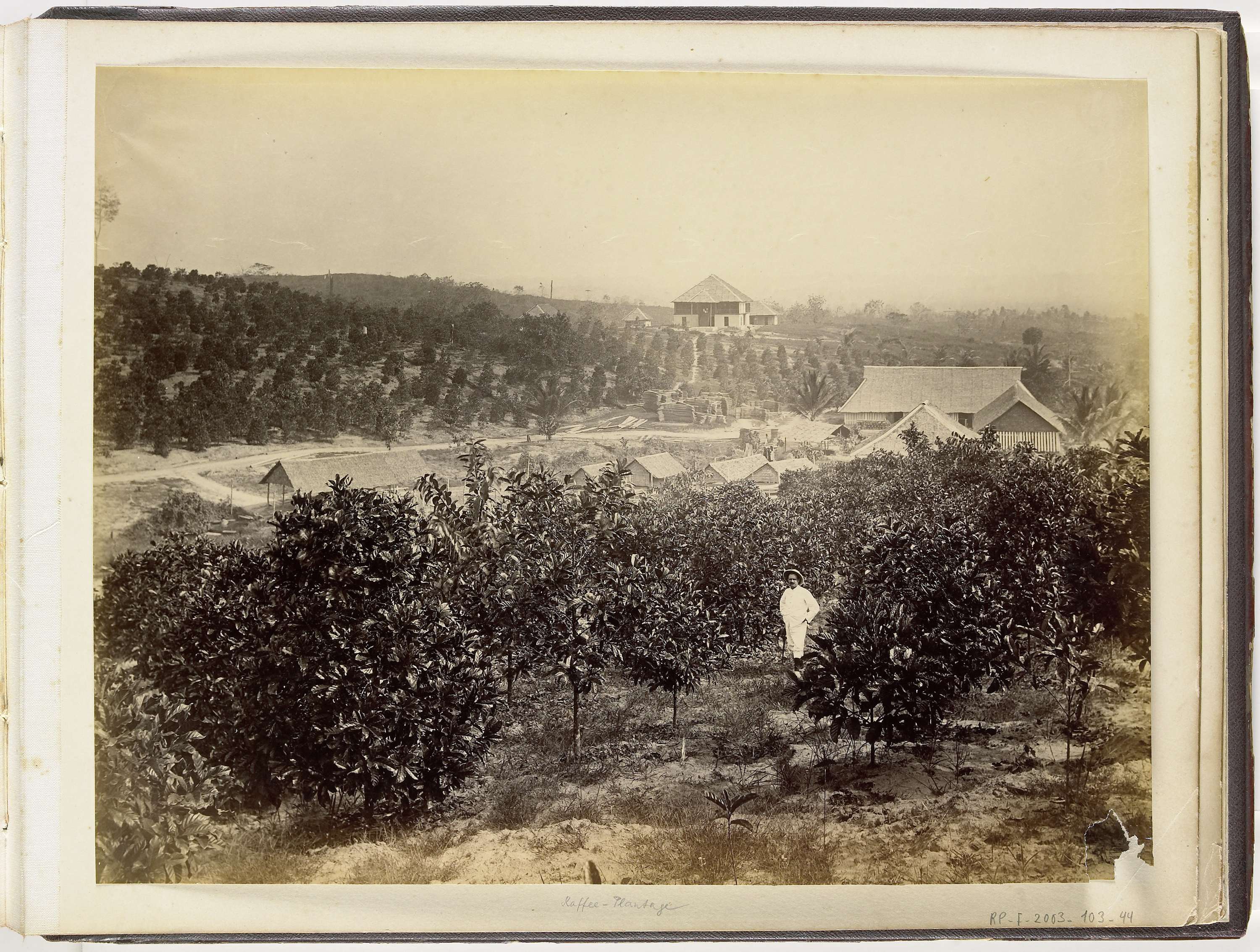 Gezicht op plantage in Langkat met Europese man, waarschijnlijk een leidinggevende of eigenaar van de plantage. Achter de man staat een bouwplaats en een aantal huizen. Onderdeel van fotoboek Paul Sandel.