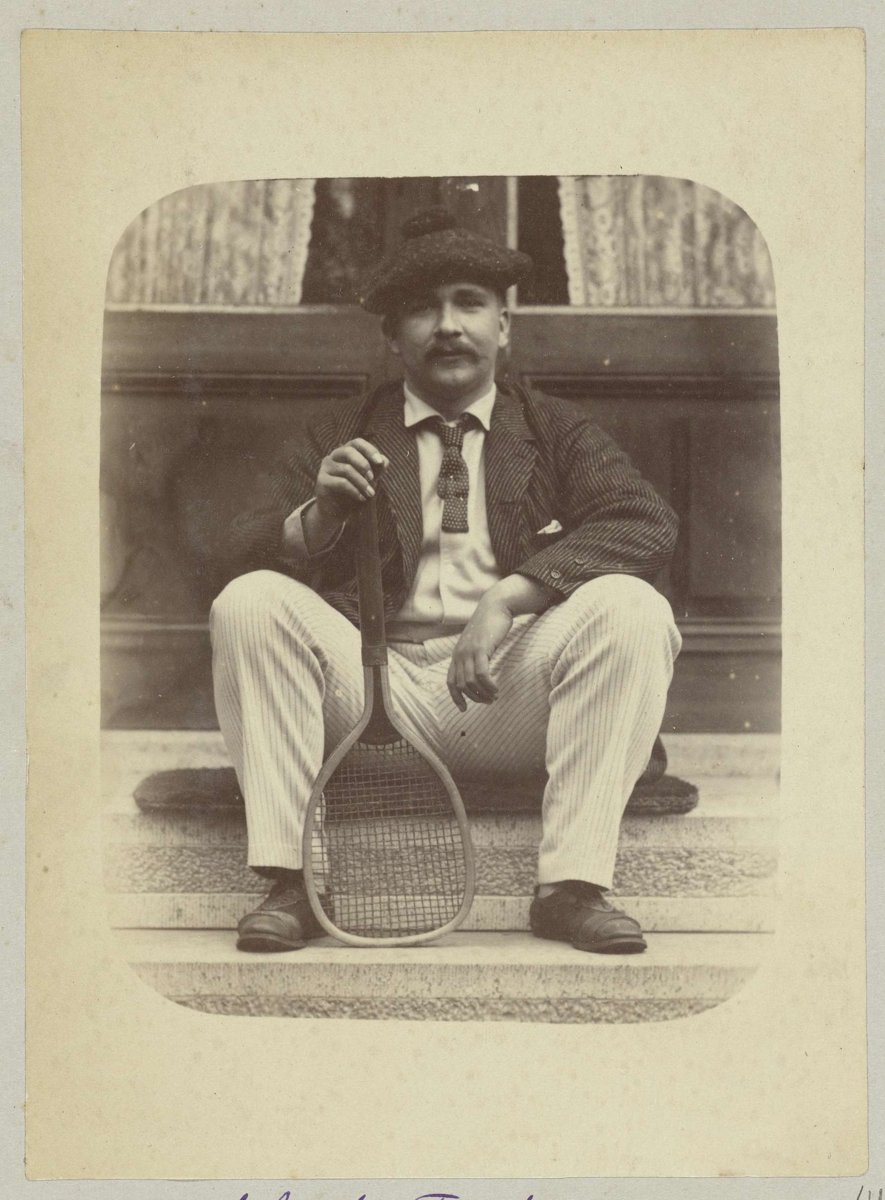 Portret van J.W. des Tombe met tennisracket