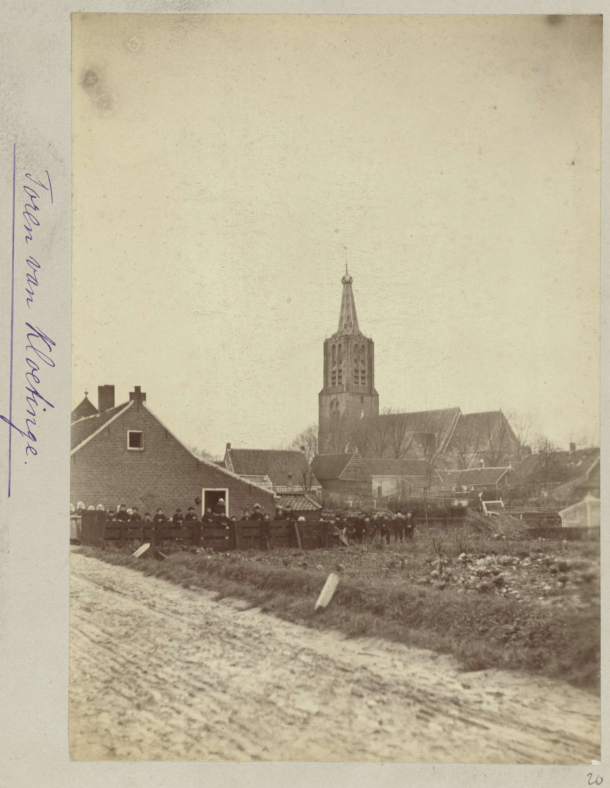 Een boerderij met achter het hek een tiental kinderen in Zeeuwse klederdracht, op de achtergrond de kerktoren van Kloetinge. Met onderschrift: Toren van Kloetinge.