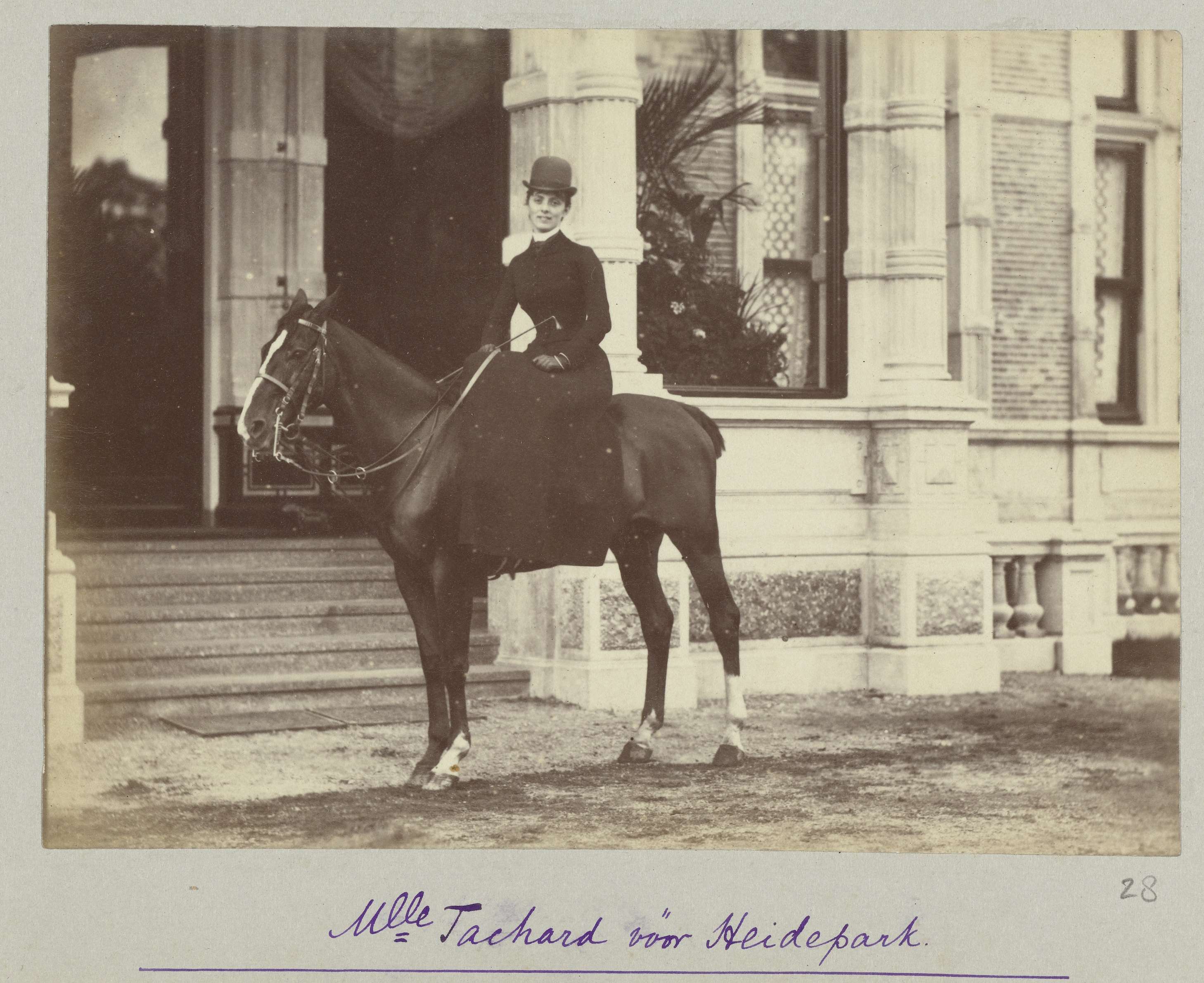 Mejuffrouw Tachard te paard voor huis Hydepark
