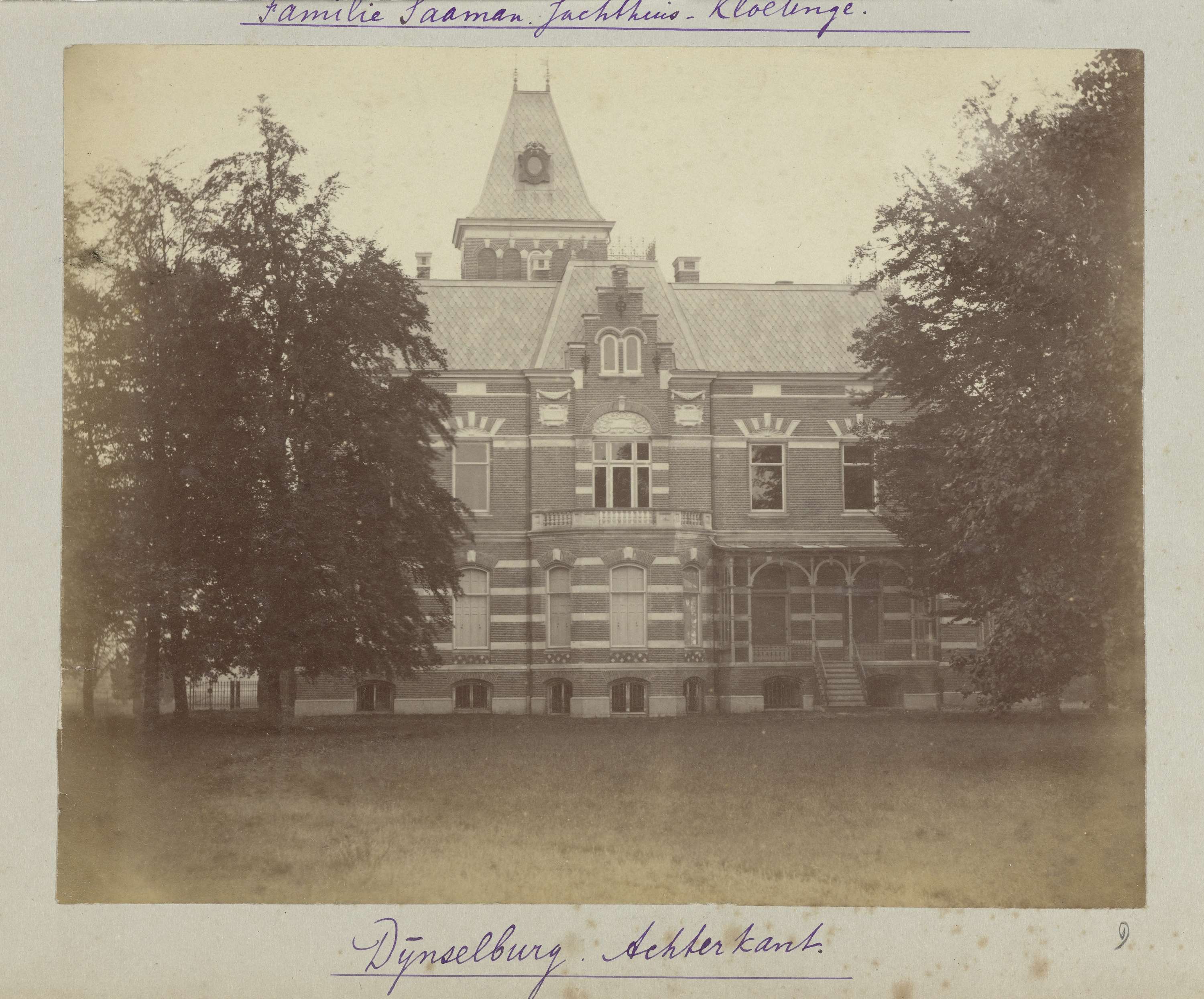 De achterkant van landhuis Dijnselburg. Met onderschrift: Dijnselburg, achterkant.