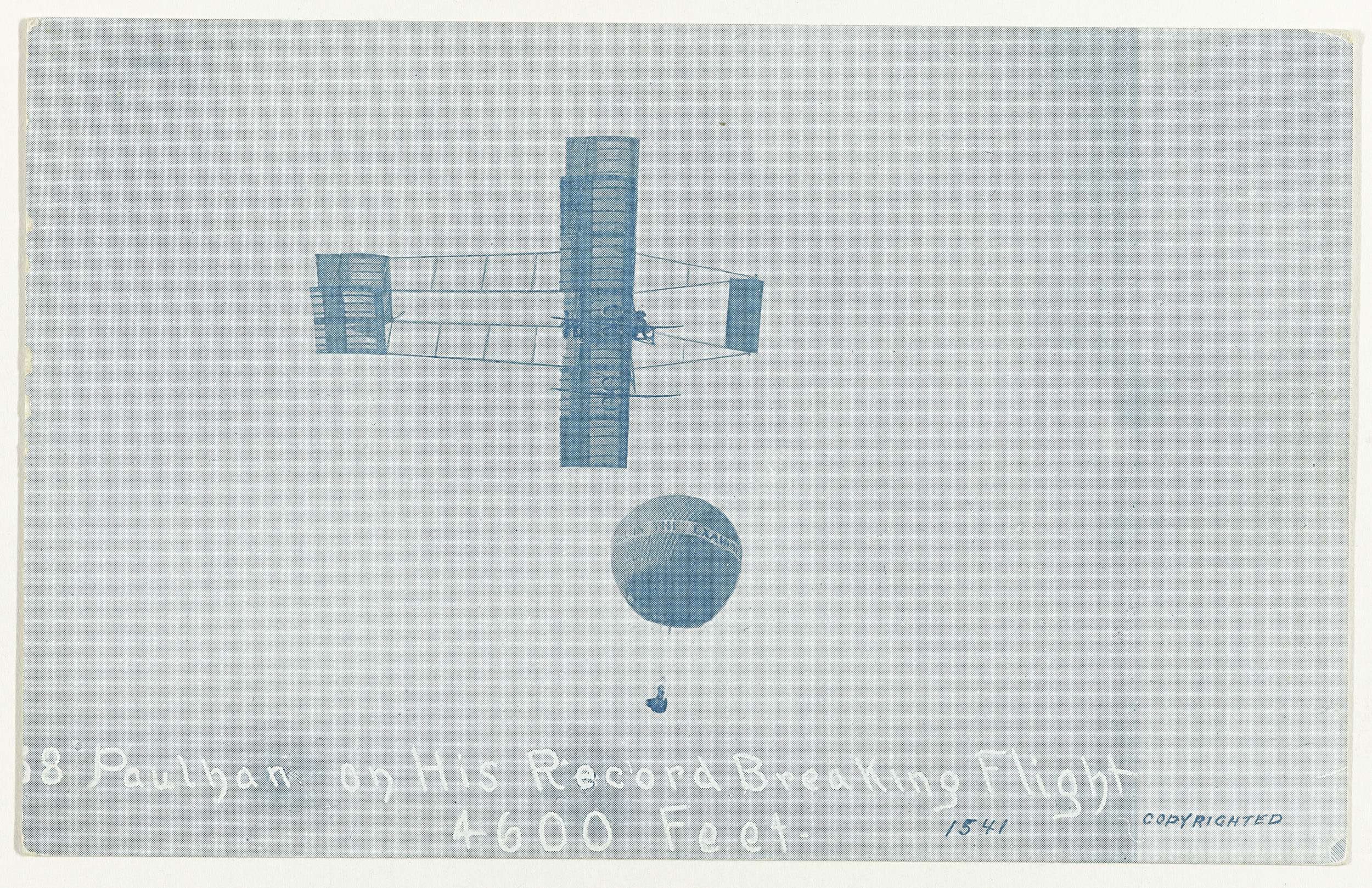 Louis Paulhan in zijn vliegtuig tijdens een vlucht (waarschijnlijk tijdens de 1910 Los Angeles International Air Meet) waarop hij het hoogterecord (1209 meter) brak
