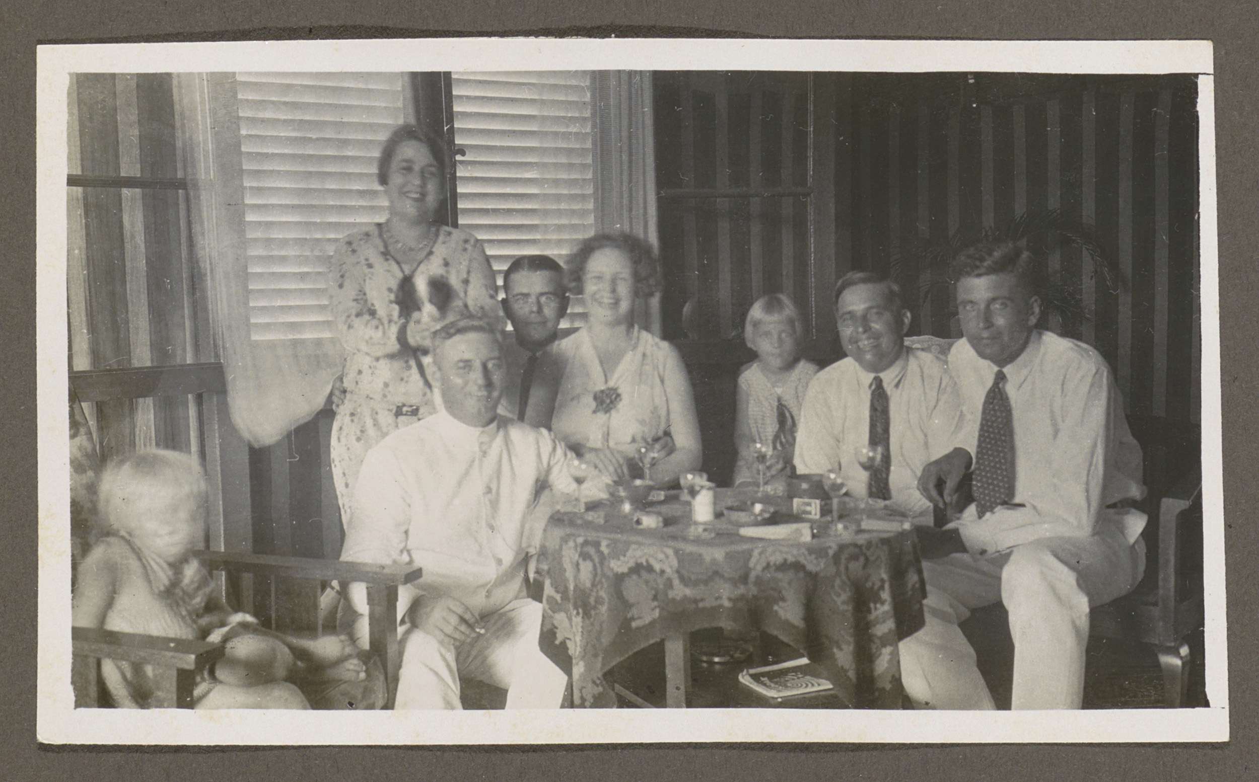Mannen, vrouwen en kinderen rondom een tafel met wijnglazen