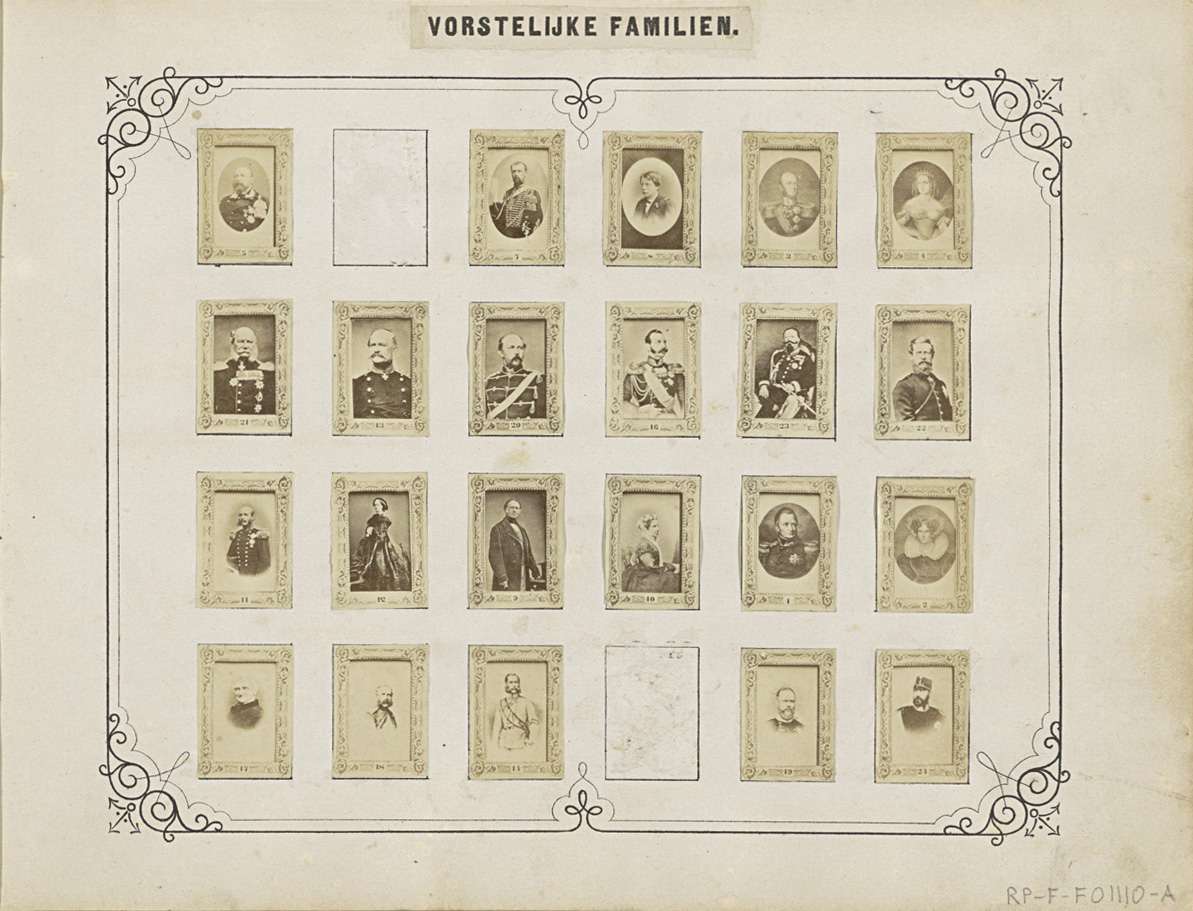 Twee albumbladen met namen en afbeeldingen van leden van vorstelijke families