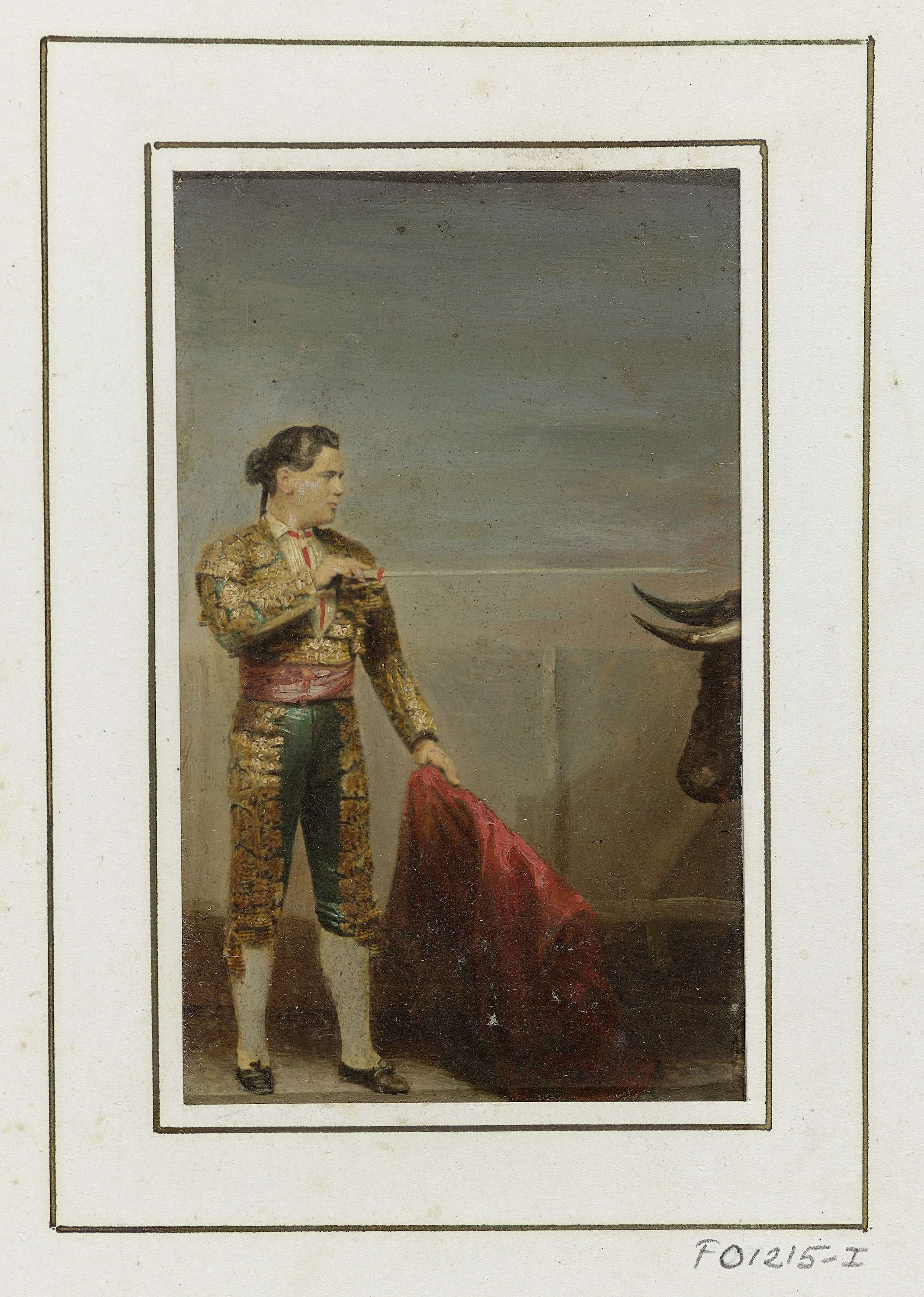 Portret van een onbekende stierenvechter (matador), met rode doek, degen en stierenkop