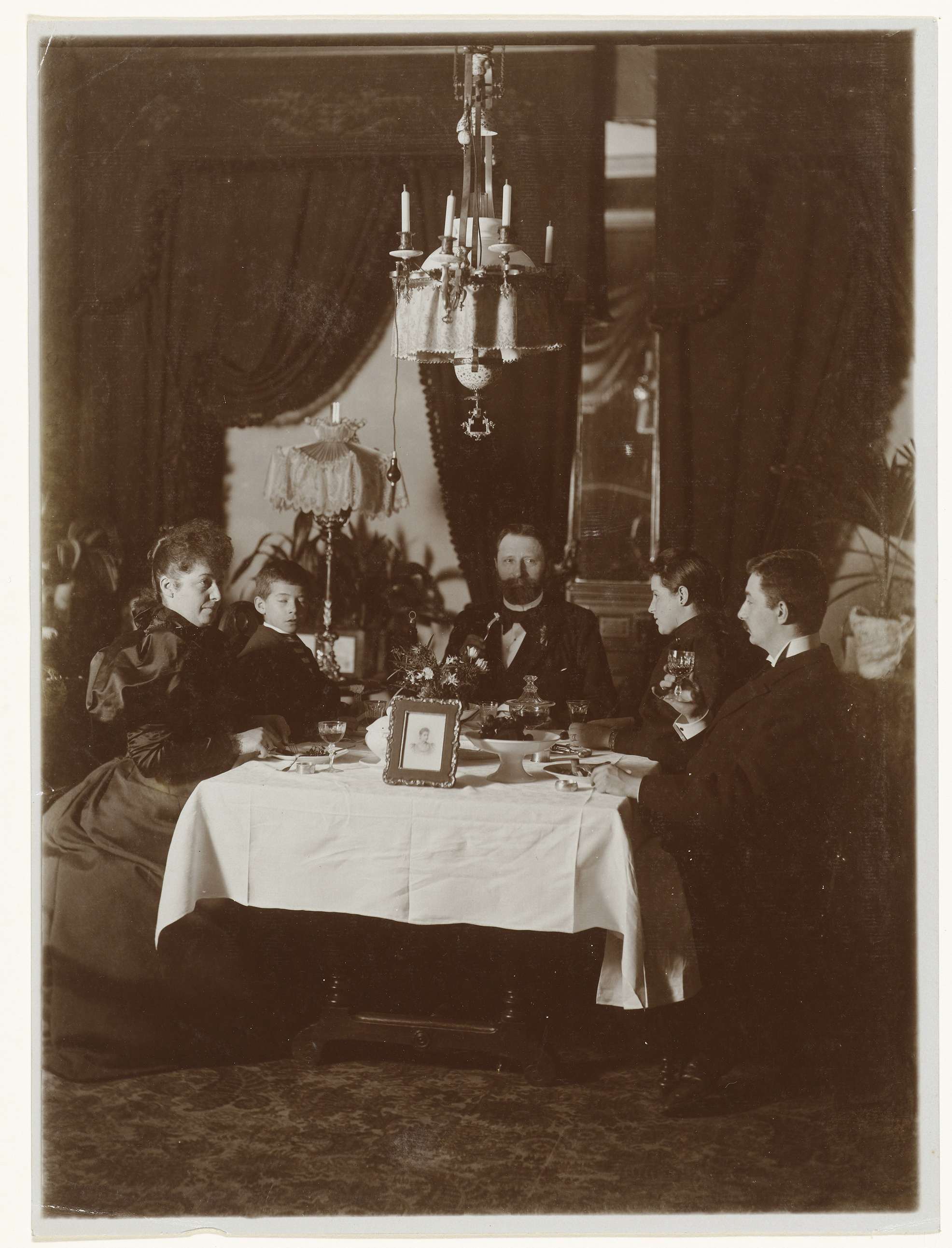 Familie aan tafel, met een fotoportret in lijst op de tafel
