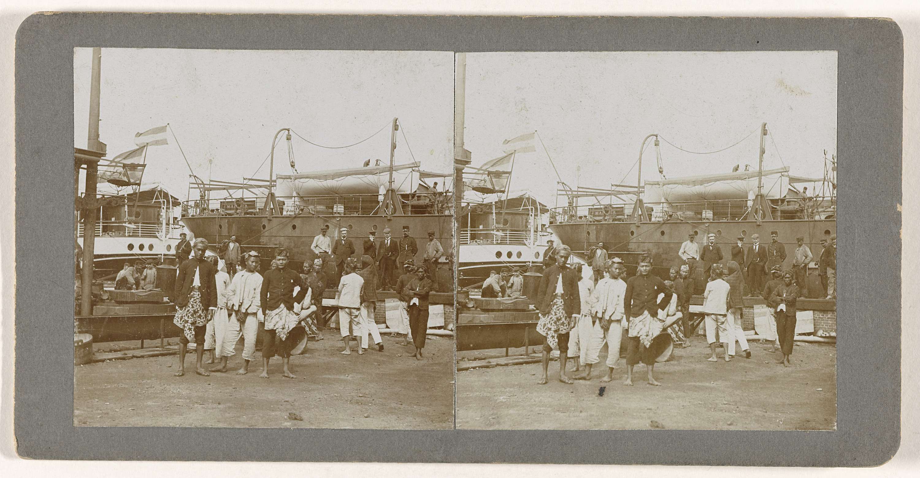 Groepsportret van onbekende Indonesiërs in de haven van Amsterdam