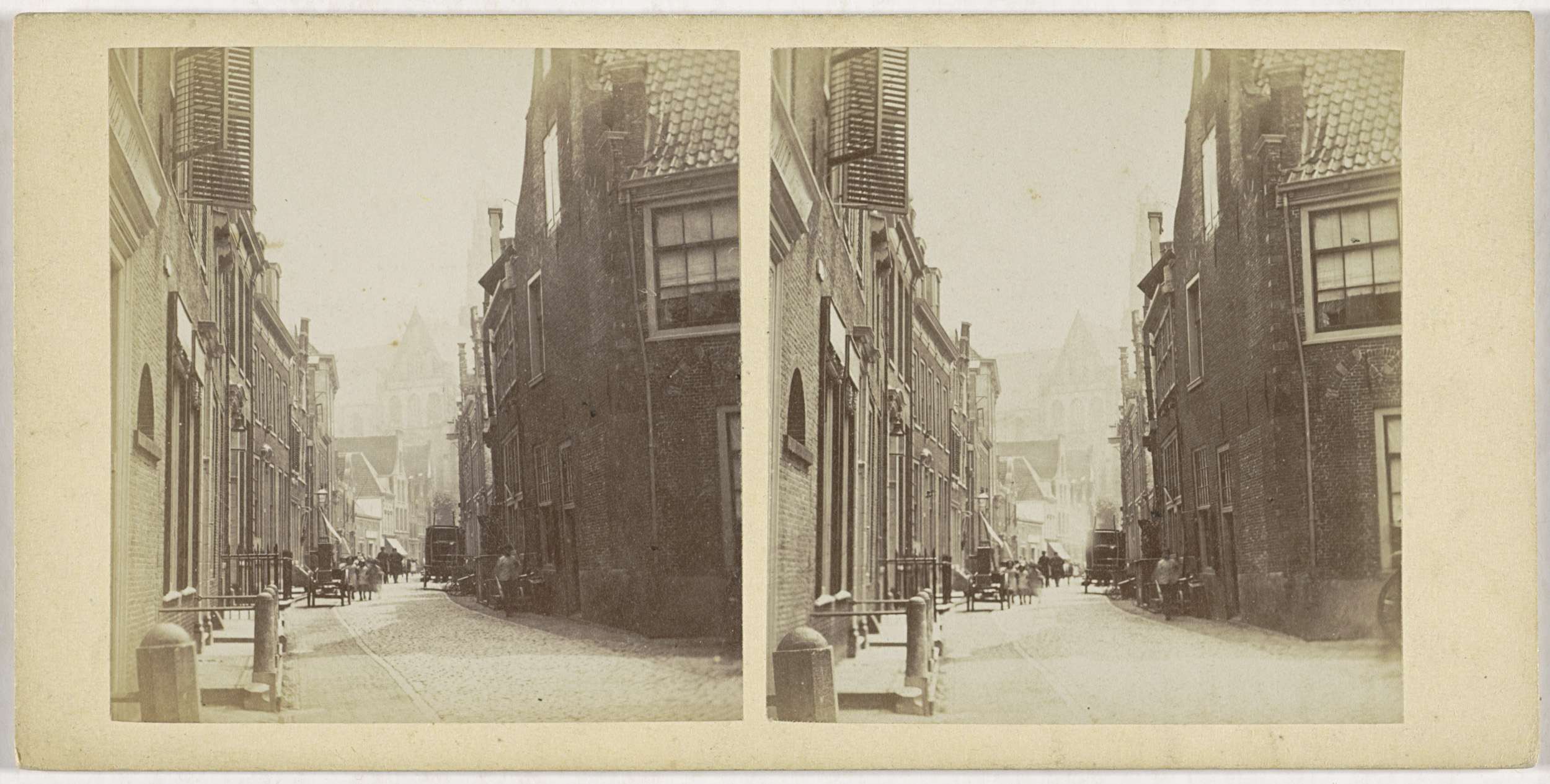 Gezicht op de Smedestraat in Haarlem met op de achtergrond de Grote of Sint-Bavokerk
