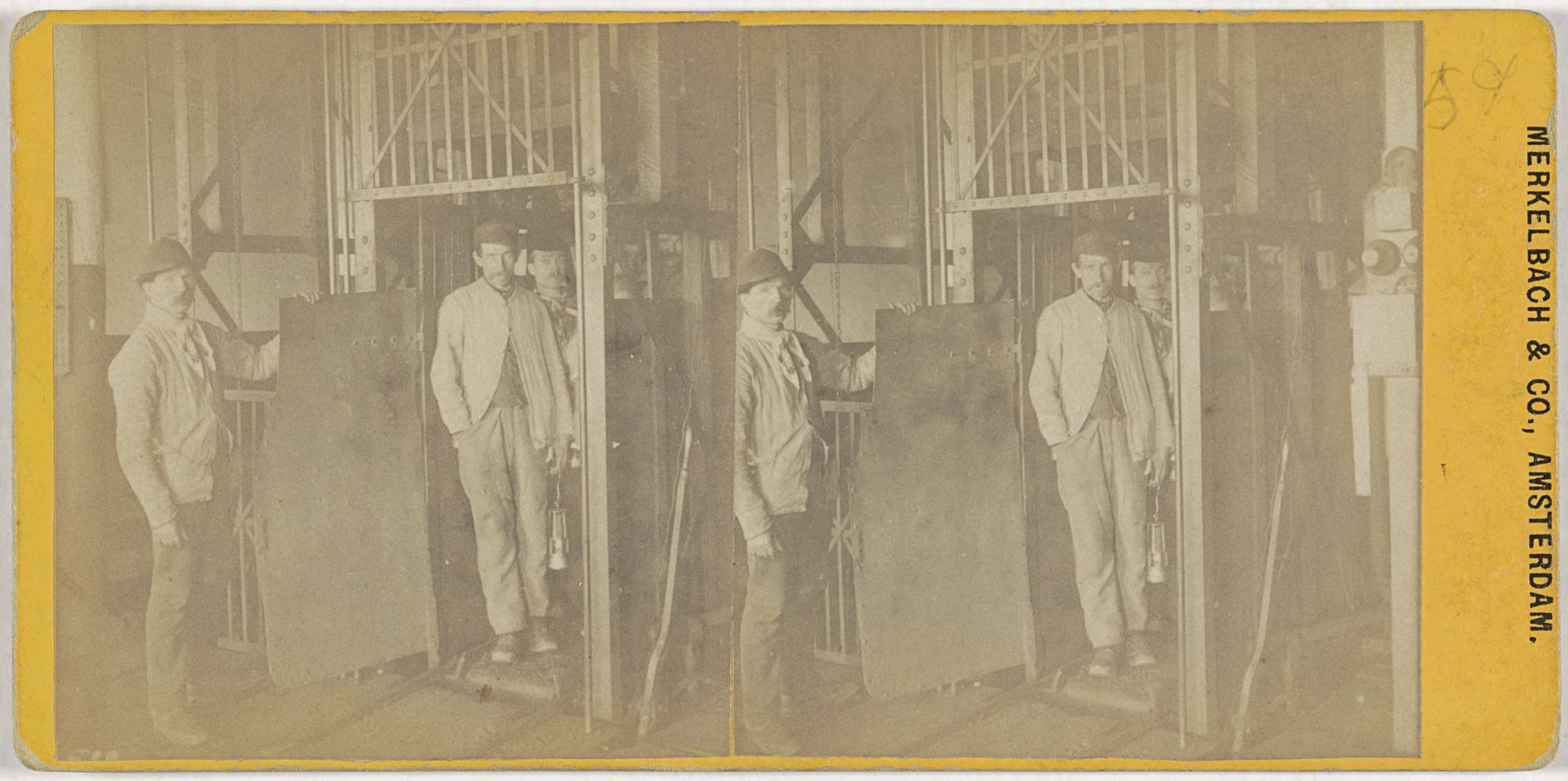 Mijnwerkers in een lift in een steenkolenmijn bij Kerkrade