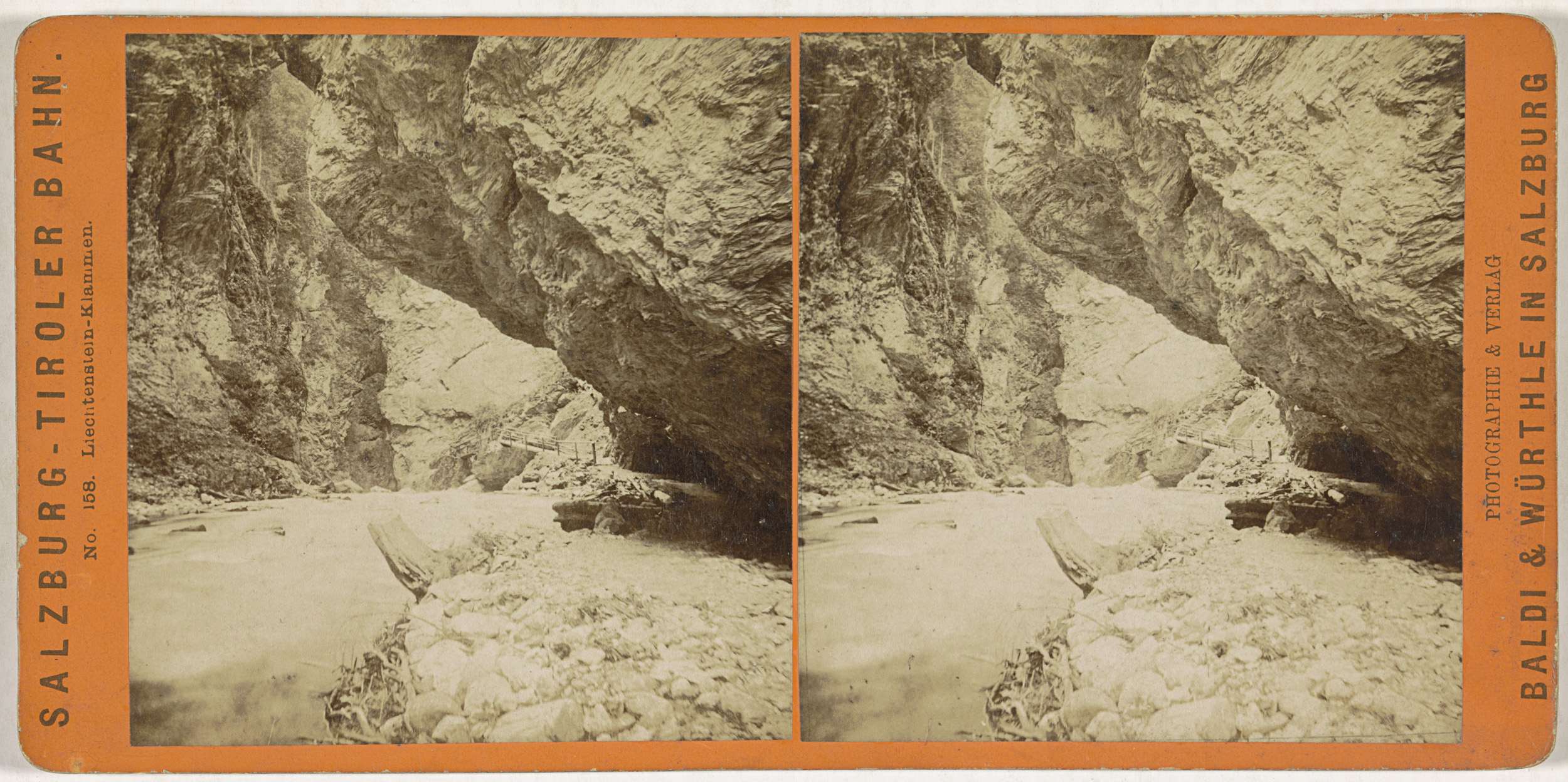 Overhangende rotsformaties en een beek in de Liechtensteinklamm