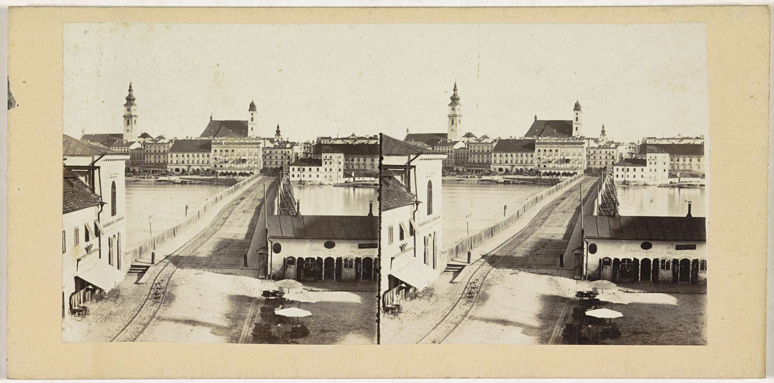 Gezicht op Linz, met op de voorgrond de houten Nibelungenbrücke