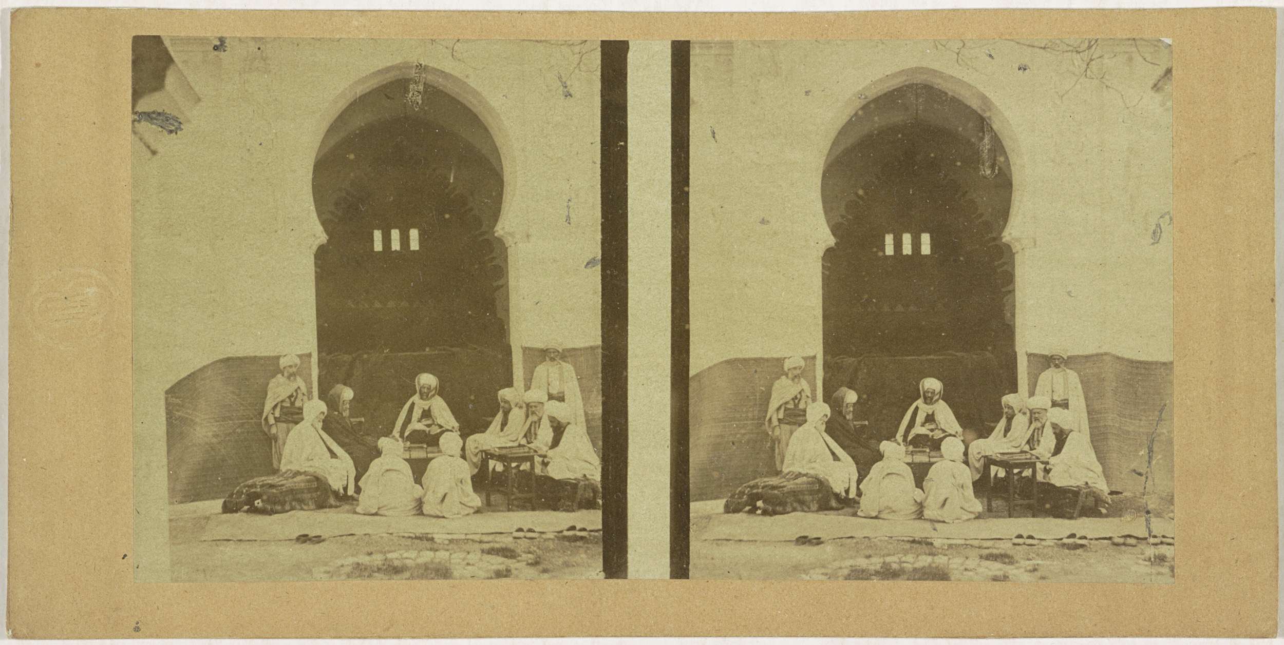 Groep mannen voor een gebouw, mogelijk een moskee, in Algiers