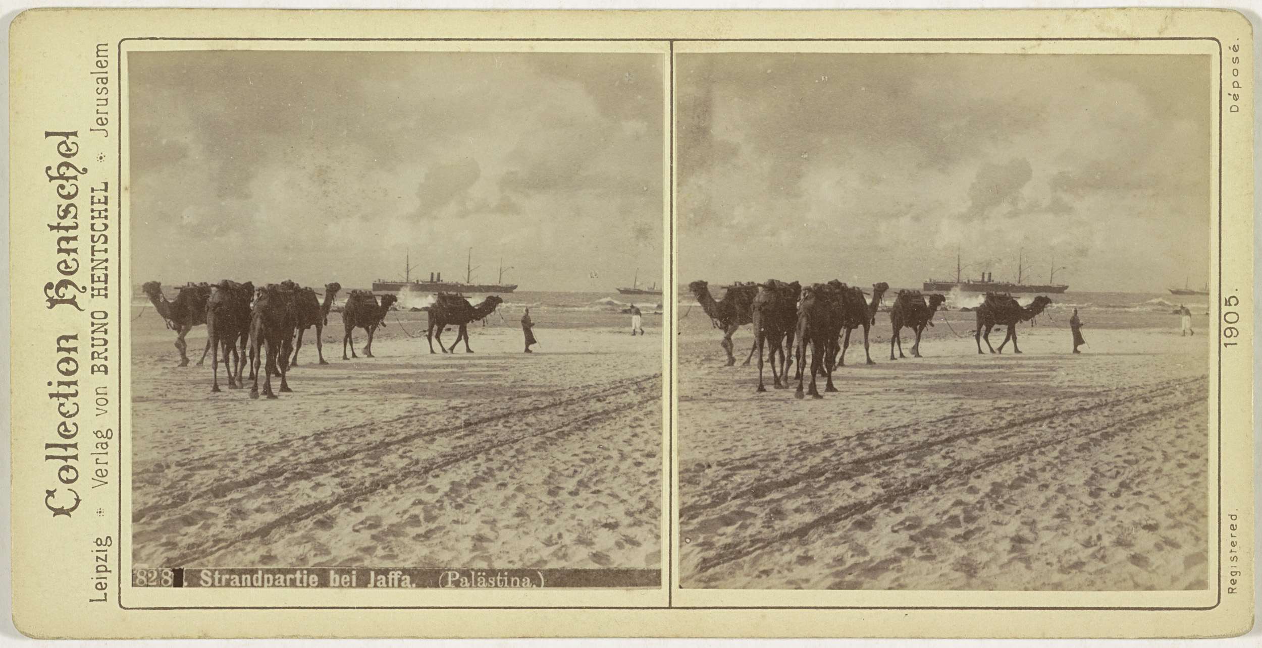 Karavaan met kamelen op het strand bij Jaffa, Israël