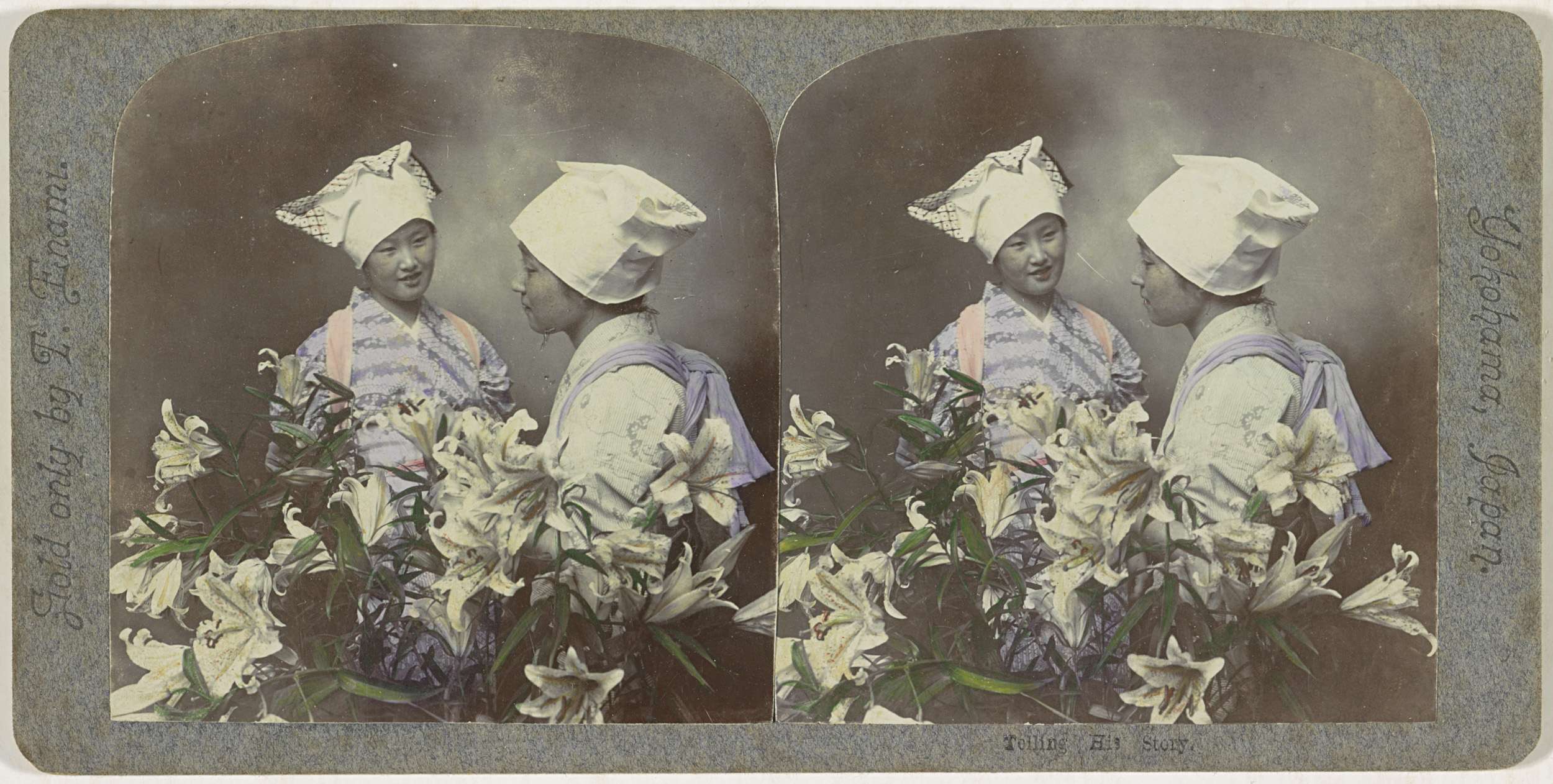 Twee Japanse vrouwen in gesprek naast een bos lelies