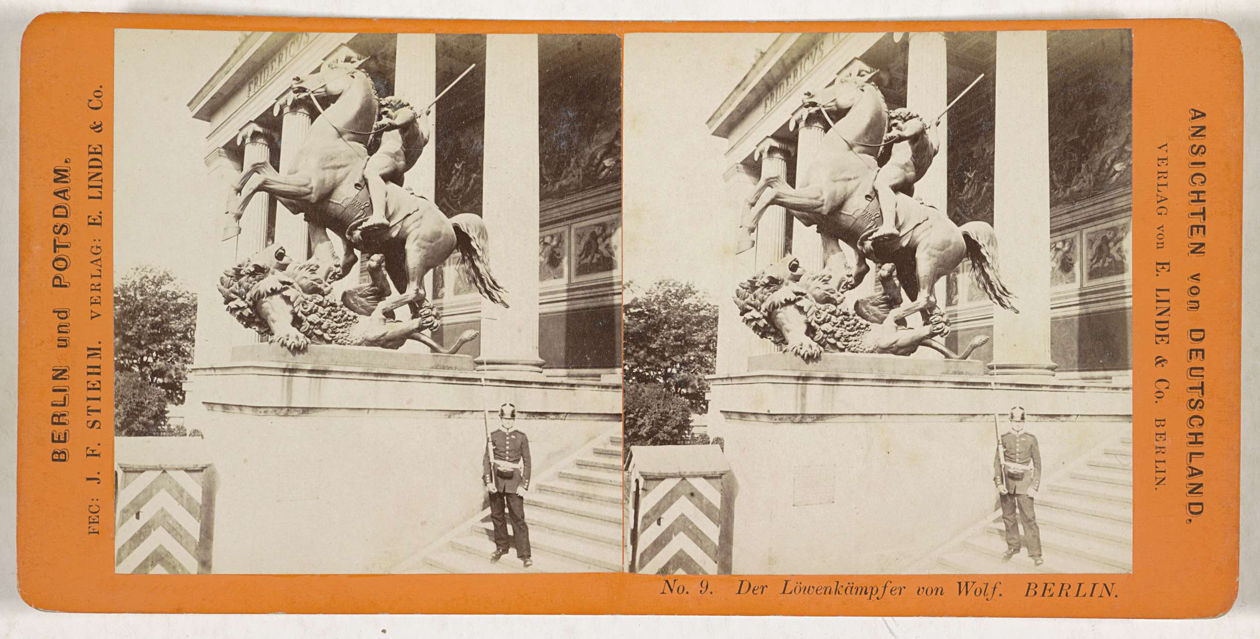Entree van het Altes Museum, Berlijn met de Löwenkämpfer van Albert Wolff en een wacht