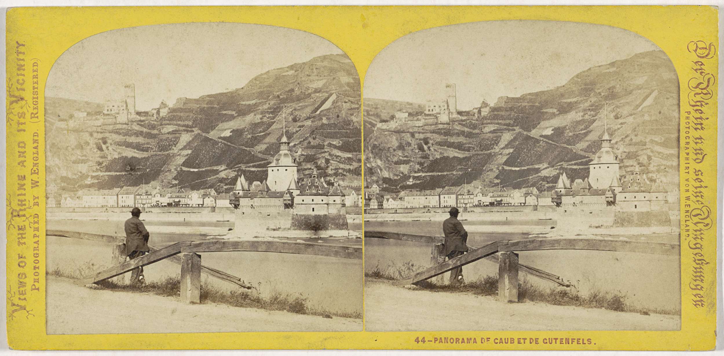 Gezicht op het dorp Kaub en de burchten van Gutenfels en Pfalzgrafenstein, Duitsland