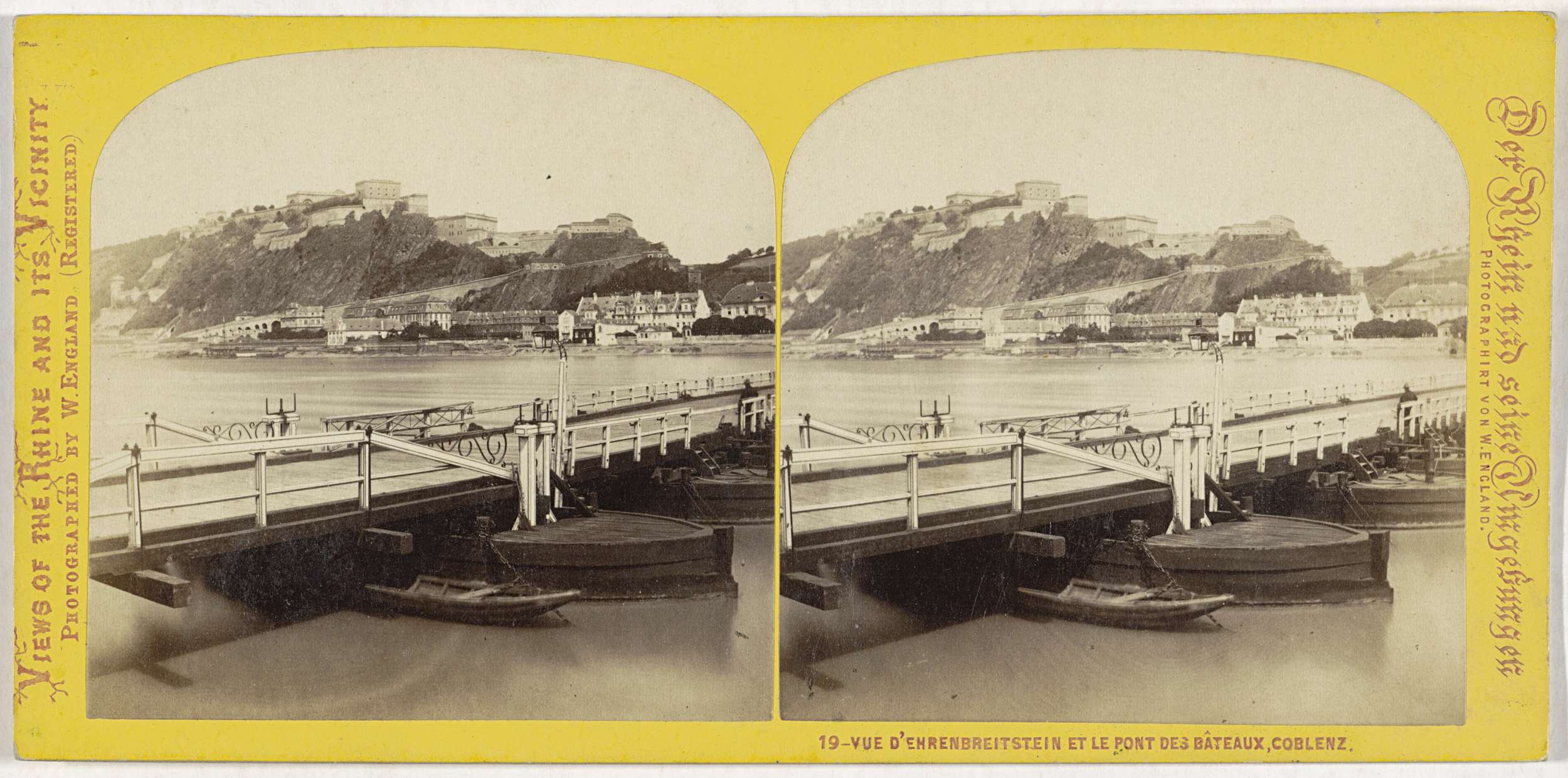 Gezicht op fort Ehrenbreistein en een botenbrug over de Moezel bij Koblenz, Duitsland