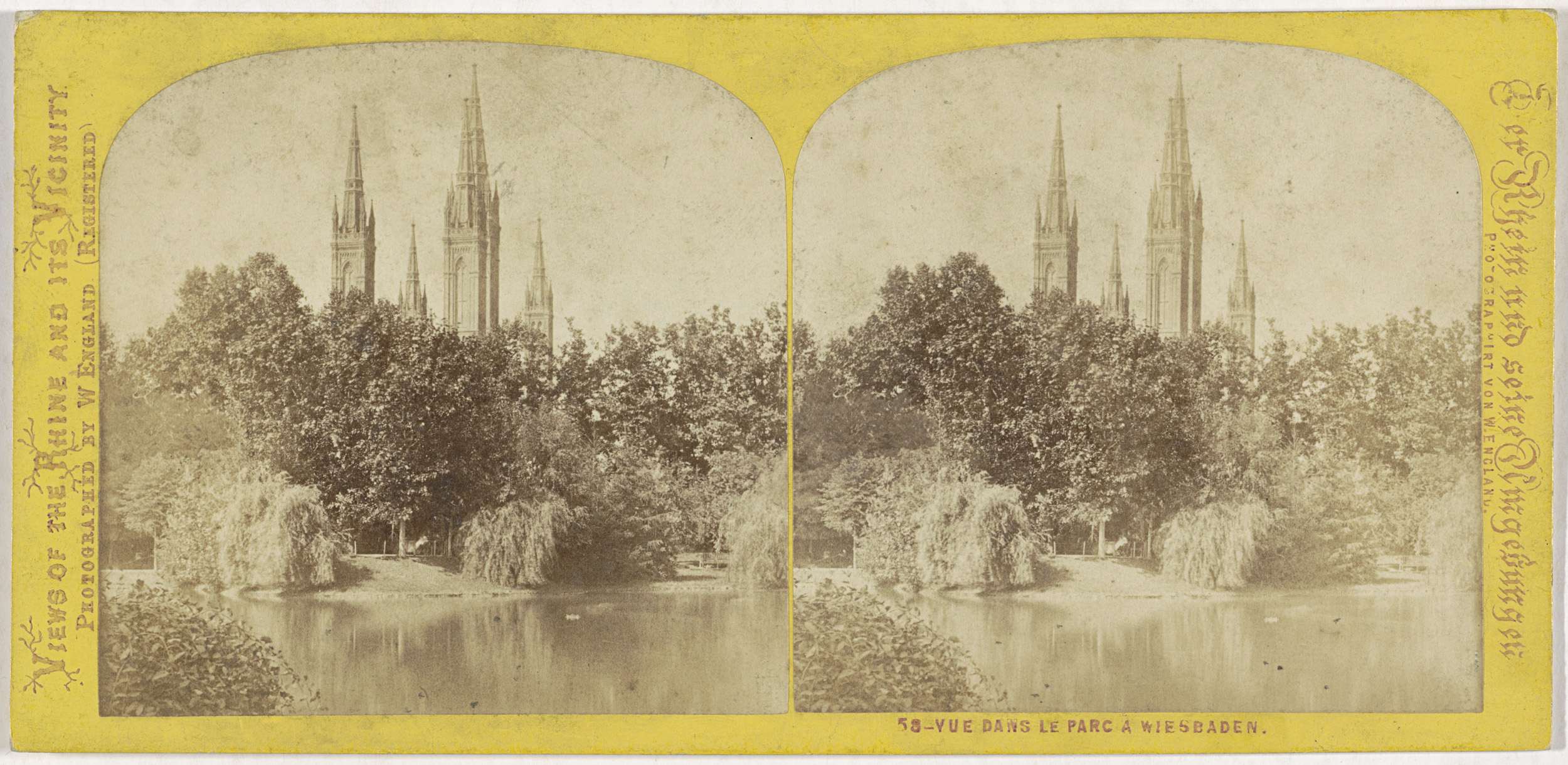 Kurpark in Wiesbaden met op de achtergrond de torens van de Marktkerk, Duitsland